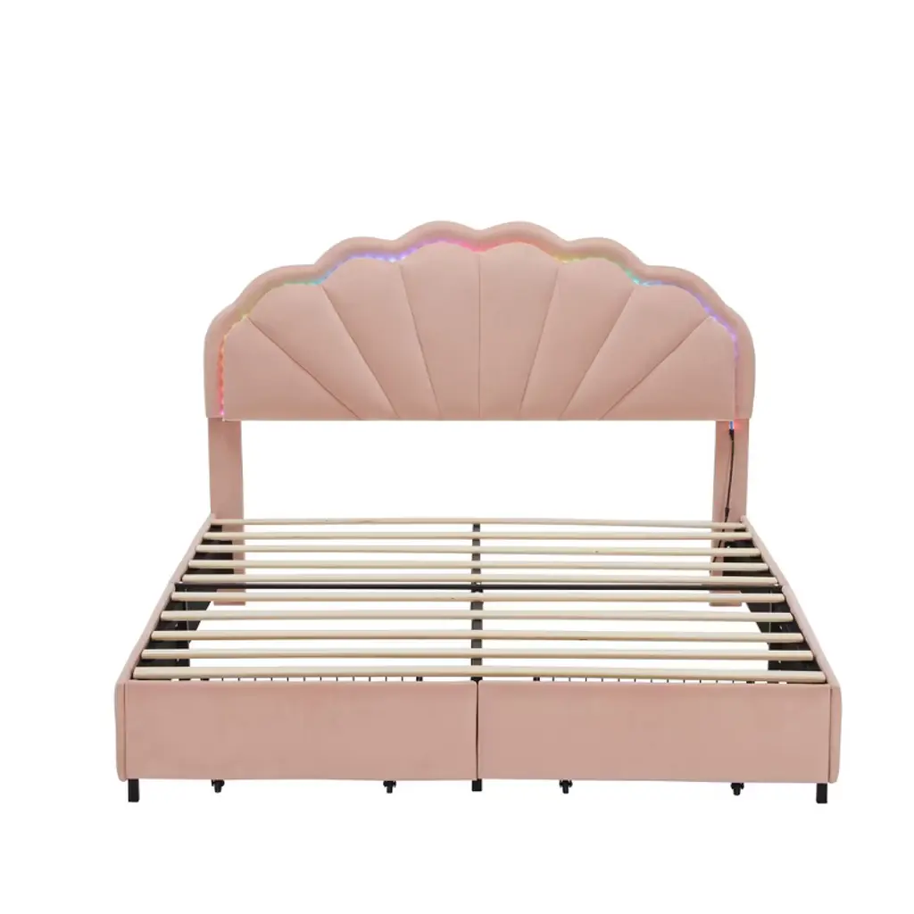 Paged Upholstered Led Bed Frame Full Size Princess Platform Bed With 2 Storage Drawers And Chic Double Petal Headboard, No Box Spring Needed, Pink