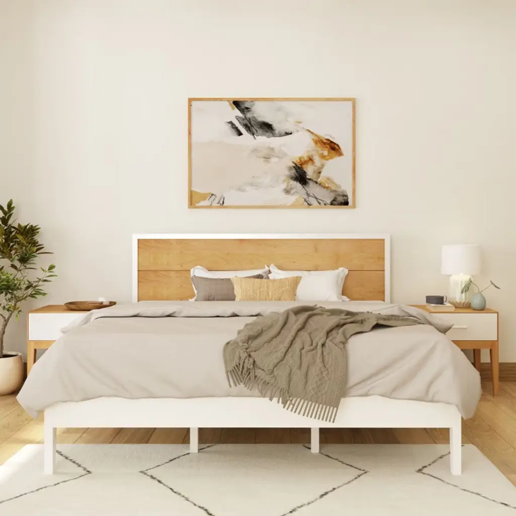 Complete your bedroom with the Plank+Beam Duo King Bedroom Set with 2 Nightstands. This bedroom set includes a king-size bed and 2 matching nightstands to give your space a cohesive and stylish look. The king bed frame features knot-free solid wood construction for superior strength and durability, while wood slats, 2 metal support bars, and 6 underbed support legs create a high 750 lb. weight capacity. Designed to fit a king-size mattress, the bed frame can accommodate all mattress types including memory foam, spring, hybrid, or latex without a box spring or Bunk Bedie board. Each bedside table features a soft-close drawer with plenty of space to keep all your everyday essentials in reach. Two-tone finishes add a stylish touch to this bedroom furniture set. This king-size bedroom set’s non-toxic finishes contribute to a clean and healthy home. This king bed set includes easy-to-read instructions, hardware and all the tools you need for a quick set up and ships in three boxes. The king bed frame measures 84” L x 79” W x 46.25” H. Each nightstand measures 24.25” L x 19.25” W x 24.25” H.