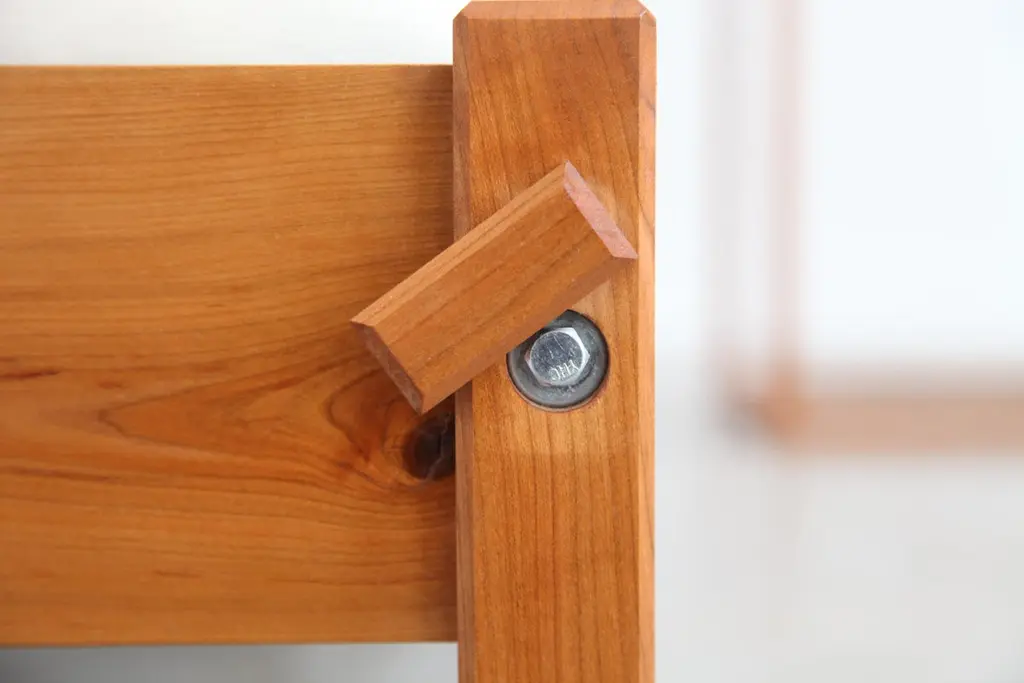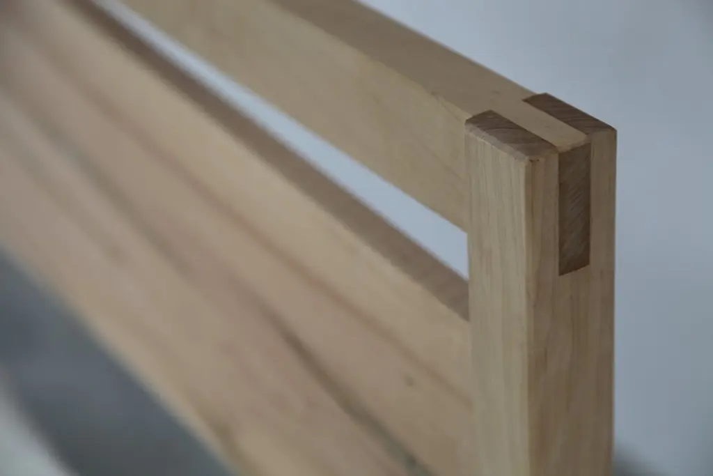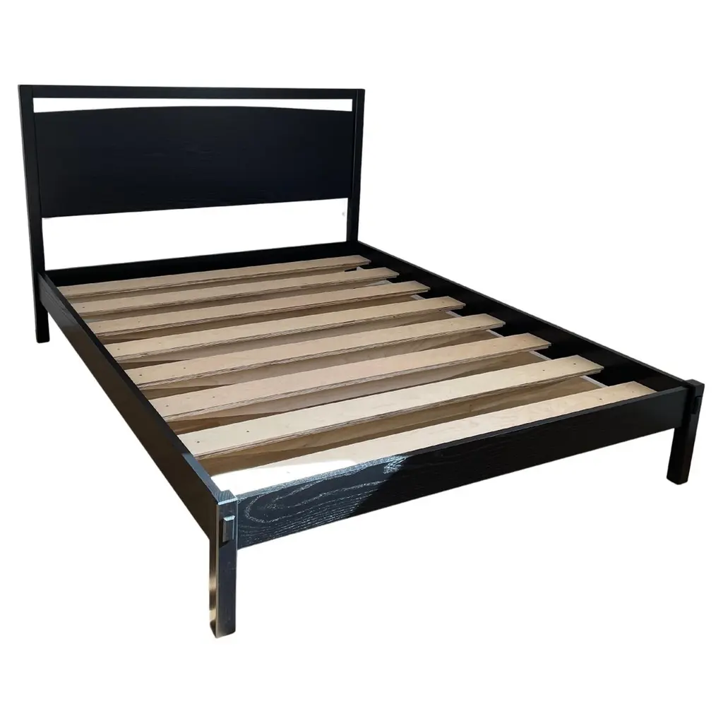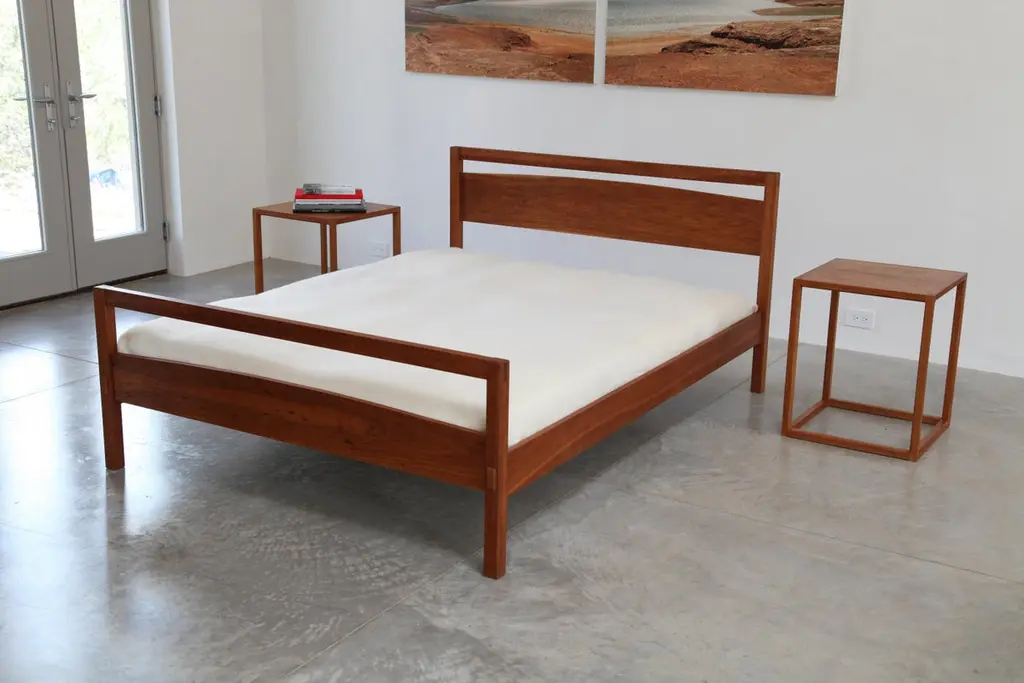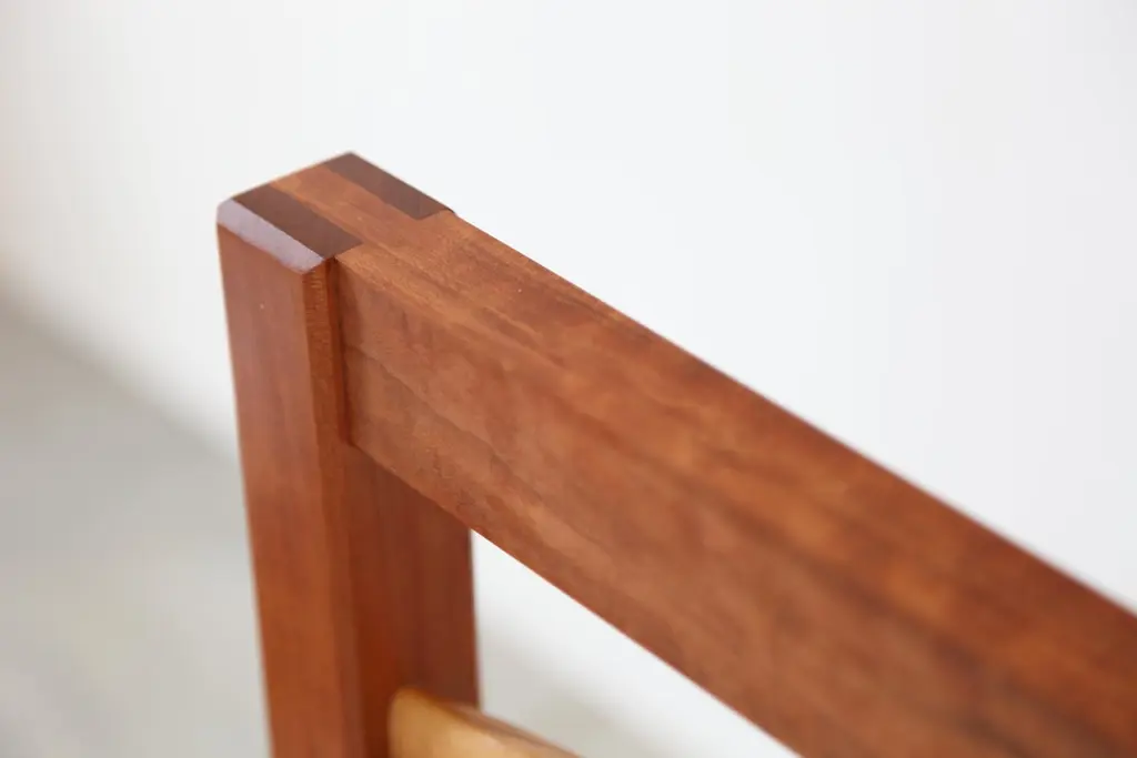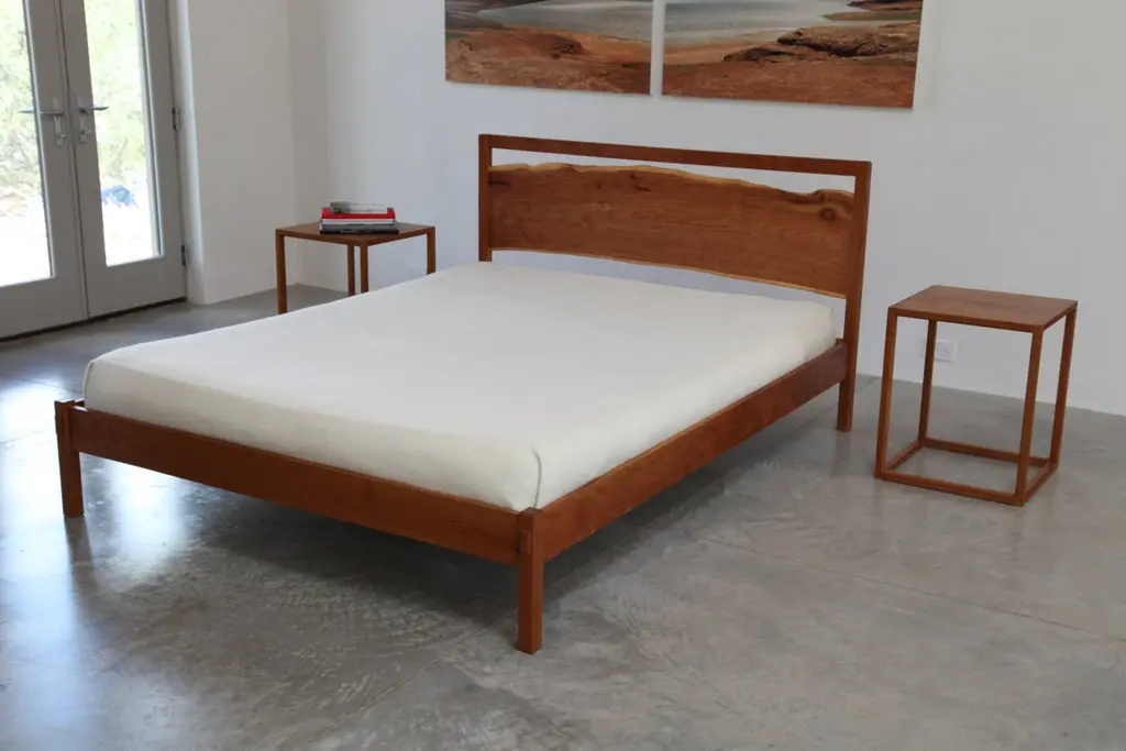 This platform bed with a bridle jointed headboard was one of our original studio designs. Boyd & Allister got its start over 12 years ago making a line of beds for a local organic mattress shop. This simple design uses traditional joinery and clean lines, allowing the beauty of the wood to be the defining characteristic. There are four different beds, all essentially the same design, pictured in this listing. We make this design in a variety of different domestic hardwoods and configurations. Pictured in this listing are: a cherry frame with a live-edge alligator juniper headboard, a maple frame with a wormy maple headboard, and a cherry frame with a cherry headboard and a more pronounced footboard and a blackened ash frame and headboard. In all of the beds a top rail above the headboard showcases hand cut joinery with an exposed bridle joint where it meets the legs. The rails between the headboard and footboard disassemble with a traditional stub tenon and bed bolt construction. There are detailed pictures of the cap, made to resemble a through tenon, on the front legs which pivots to reveal the bed bolt. Each bed comes with a set of 8 slats that are constructed with reinforced hardwood ribs that make the slats rigid and prevent flexing. The total headboards of these beds are 42” tall and made for a 10” mattress to come to the bottom of the headboard (forgive the pictures as we only had a thin futon available for the photo shoot). It is not a problem to alter the height of the headboard to accommodate a thicker mattress. Finish is a natural oil and wax