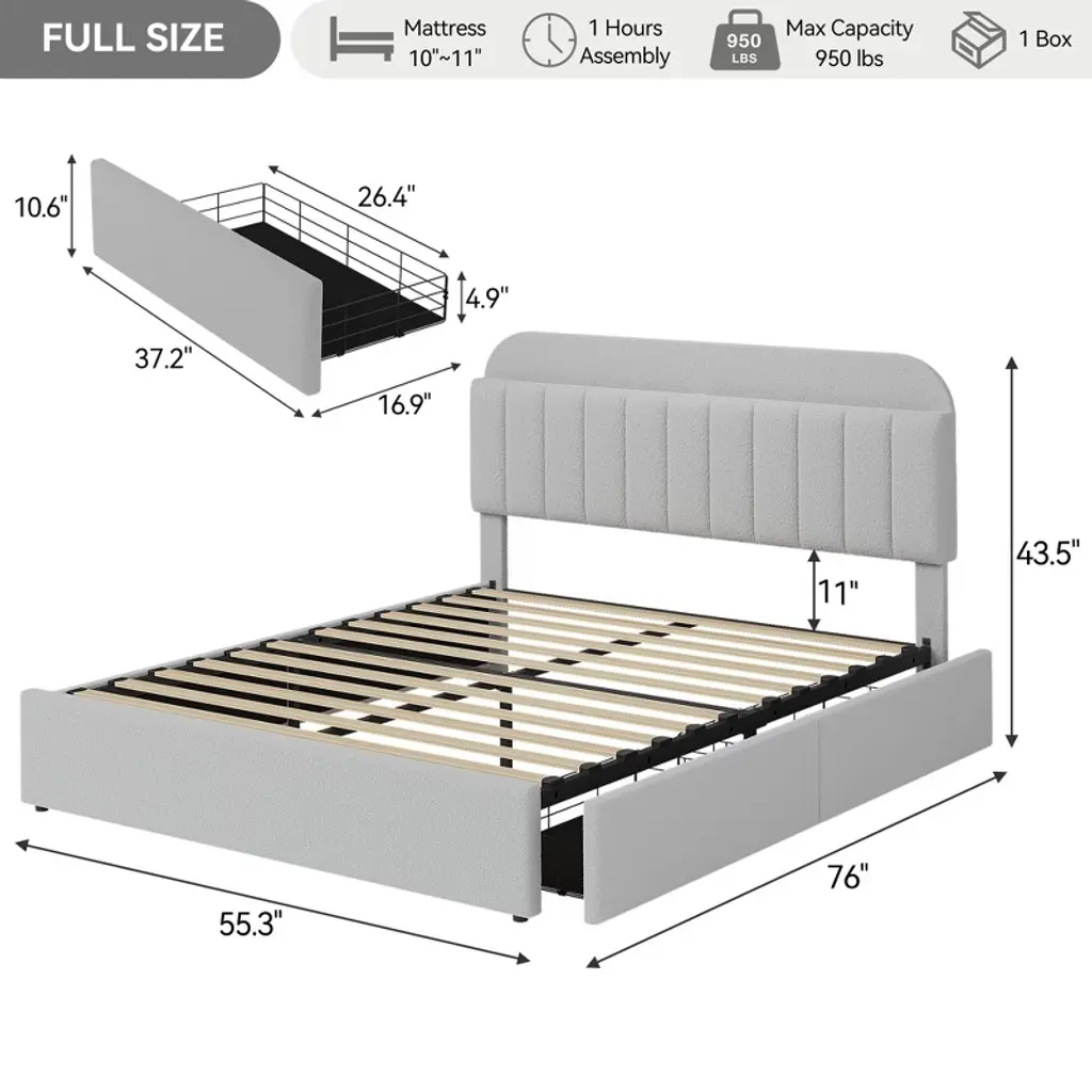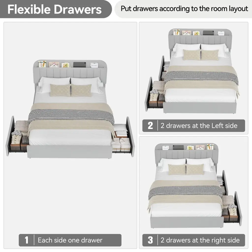 Maximize your bedroom space with this chic platform bed featuring a boucle upholstered headboard with built-in storage perfect for books and devices. Two versatile drawers provide flexible under-bed storage solutions. Crafted with a sturdy metal frame and wooden slats, this bed ensures solid support and quiet comfort. Easy to assemble in about an hour, it blends style and function seamlessly.
