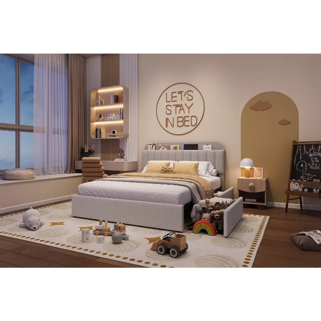 Queen Size Kids Bed Frame For Boys, Boucle Upholstered Platform Bed With Bookcase Headboard & Storage Drawers, No Box Spring Needed, Grey
