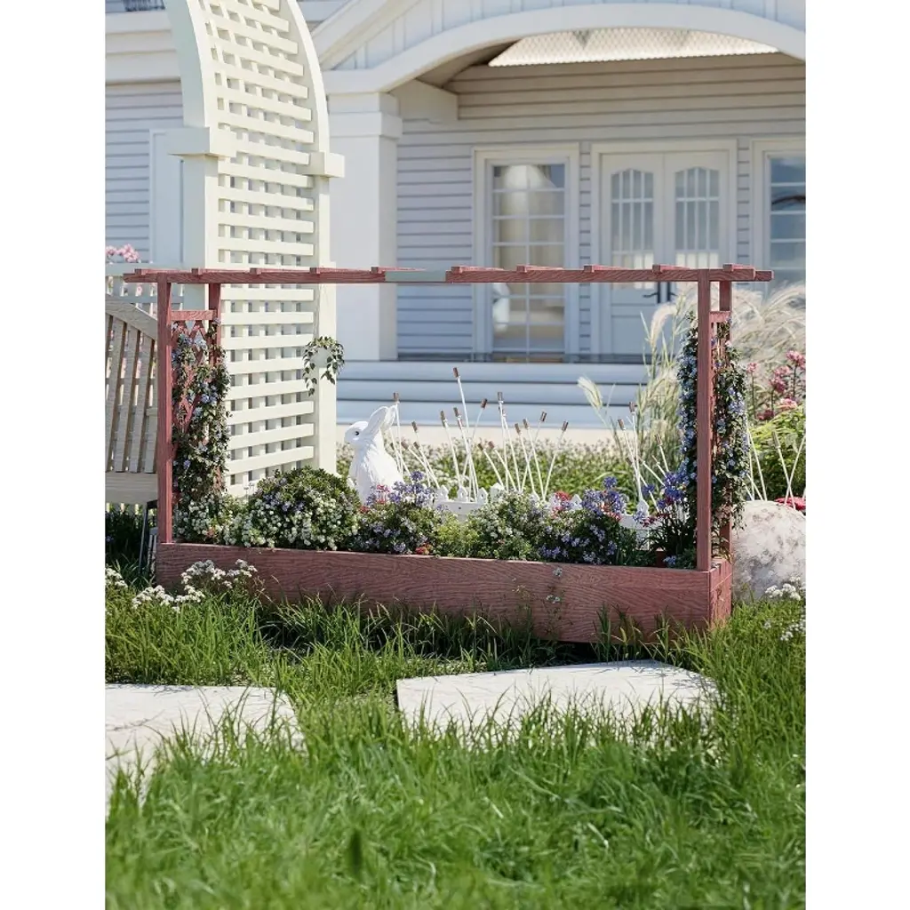 The raised garden bed features a large planter box with a hanging roof and two side trellises, offering ample space for climbing plants and flowers, making it an ideal freestanding option to maximize gardening potential