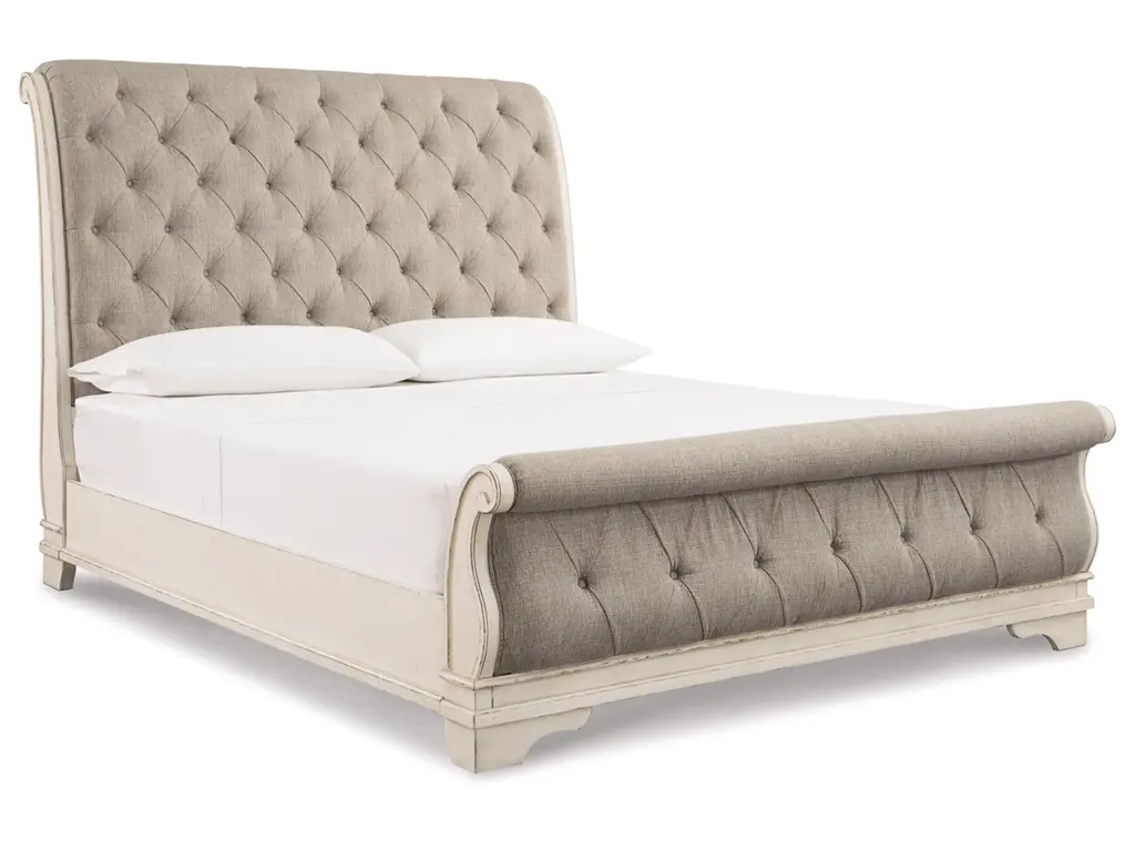 Elevating the art of traditional cottage styling, the Realyn bedroom set is your dream retreat realized. A sumptuous beauty, the upholstered bed wows with a distressed chipped white finish for heirloom appeal. Deep tufting on the cushioned upholstered headboard and footboard adds such a cozy element sure to put you at ease. Framed drawer fronts, decorative corbels, bail pulls and contrasting wood finished surfaces only add to the charm.