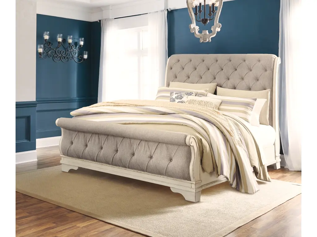 Elevating the art of traditional cottage styling, the Realyn bedroom set is your dream retreat realized. A sumptuous beauty, the upholstered bed wows with a distressed chipped white finish for heirloom appeal. Deep tufting on the cushioned upholstered headboard and footboard adds such a cozy element sure to put you at ease. Framed drawer fronts, decorative corbels, bail pulls and contrasting wood finished surfaces only add to the charm.