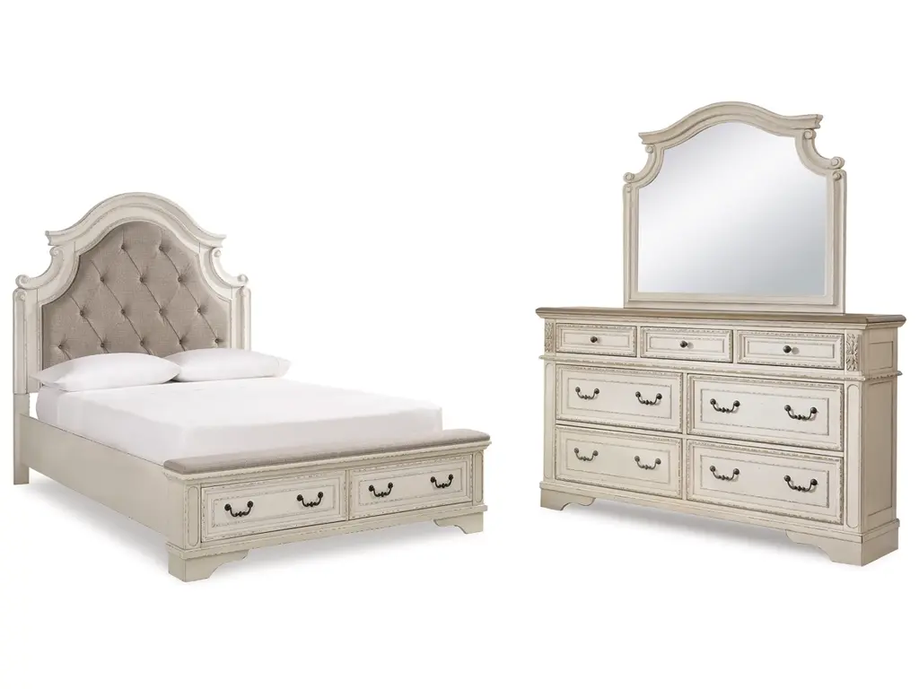 Elevating the art of traditional cottage styling, the Realyn bedroom package is your dream bedroom retreat realized. The bed's ornately shaped headboard with inset upholstered cushion brings cozy charm. The dresser features an antiqued two-tone aesthetic, blending a chipped white with a distressed wood finished top for added appeal. Framed drawer fronts and decorative corbels add refinement, while bail pulls in a dark bronze-tone finish lend a classic touch.