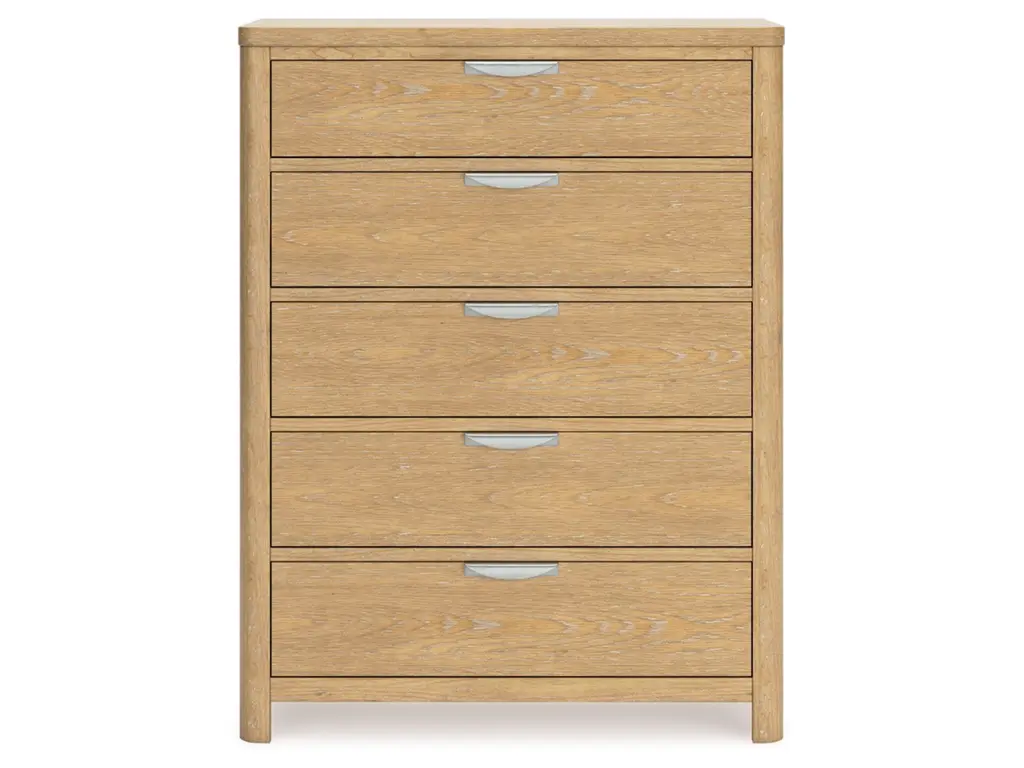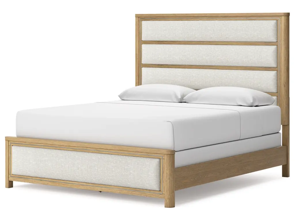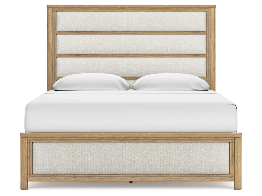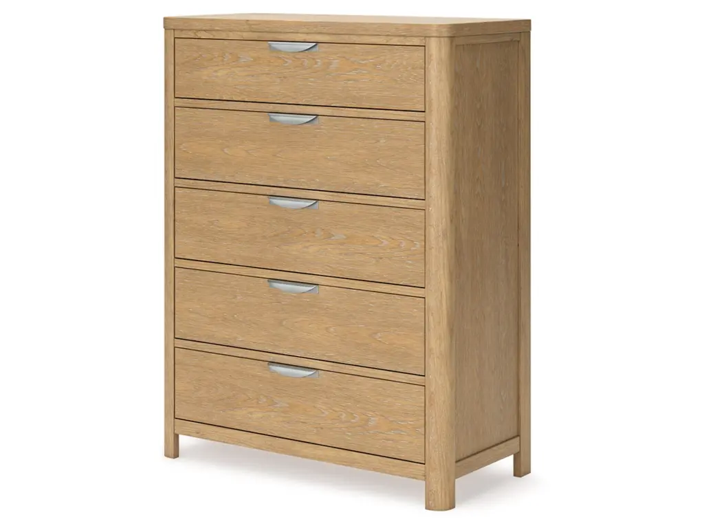 The Rencott bedroom package's classic yet contemporary good looks are hard to deny. Softly shaped posts with a light oak finish and wire-brushed wood grain texture lend an organic appeal to your soothing space.