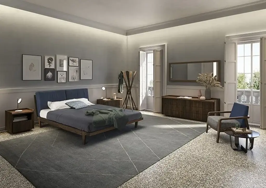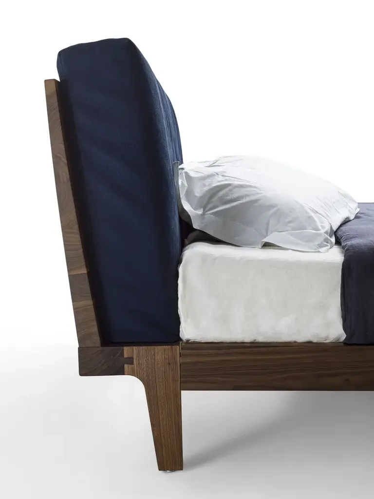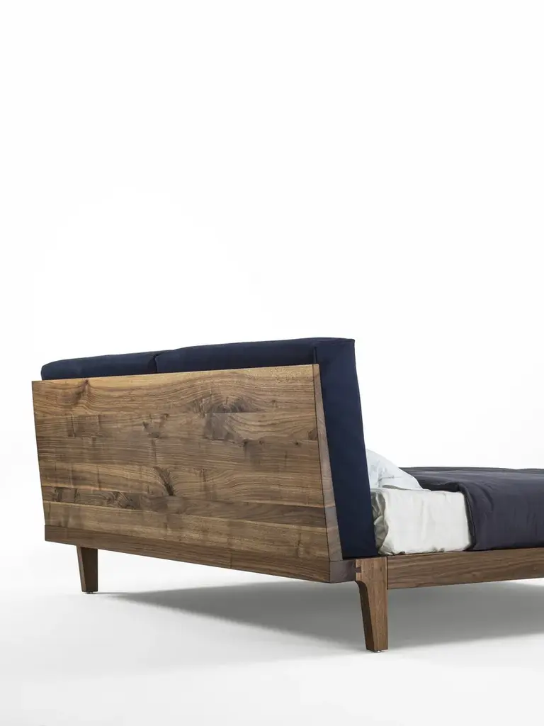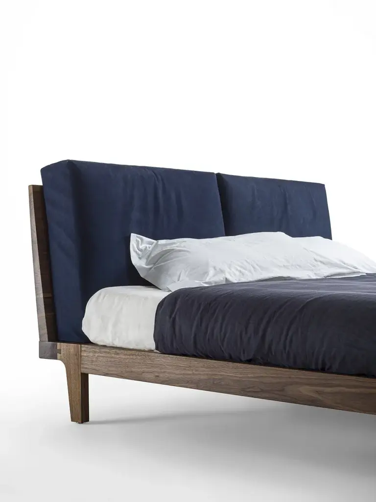 REVO SOFT BED is a bed entirely made of solid wood, characterized by dovetail joints that connect the feet to the structure. Cushions covered in leather or fabric increase its comfort. AVAILABLE FINISHES:A1: walnut without knots, walnut with knotsA2: oak without knots, oak with knots, cherryD1: fabric: canvas, Milano - M 107, Tokyo - M 115, bouclè - M 150D2: fabric: mapleD3: leather: suede, crystalD4: leather: utah, nubuckD6: customer leather, customer fabric trim