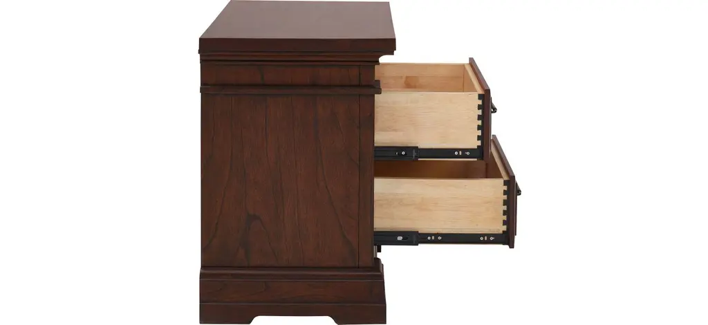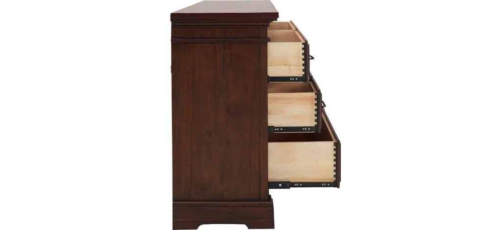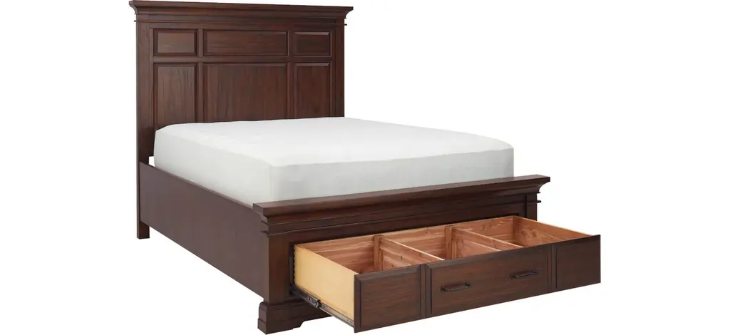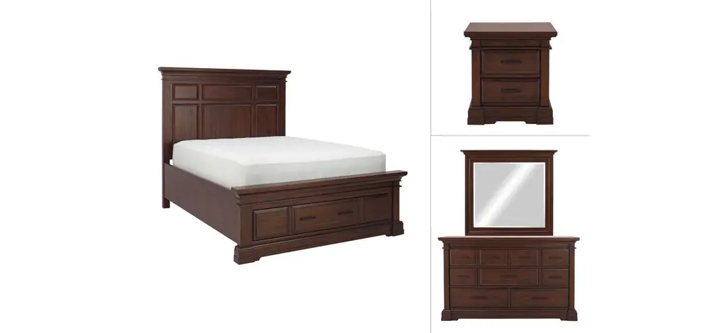 Each piece in this Richmond 4-pc. Queen Platform Storage Bedroom Set has a rich, dark finish that looks wonderful in a traditional style bedroom setting. The set includes a Richmond Queen Platform Storage Bed with a large footboard storage drawer with dividers, beveled Mirror, Dresser and Nightstand.
