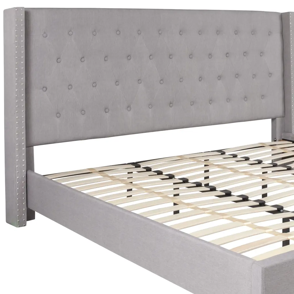 Look no further, you've found the bed of your dreams at a price no one will believe. This gorgeous platform bed will keep your bedroom looking fresh for years. This beauty is adorned by nailhead trimming on the protruding sides and has a button tufted panel headboard. The headboard has a decent amount of height to prop yourself up against it. No footboard means you have easy access to make up your bed. The low base frame provides you with an open concept feel. Select your mattress and settle in for peaceful resting knowing that the frame is supported by wooden slats that are designed to support your mattress without the use of a box spring. You deserve a job well done for selecting such a breathtaking bed that will give your space the uplift that you've been yearning for.