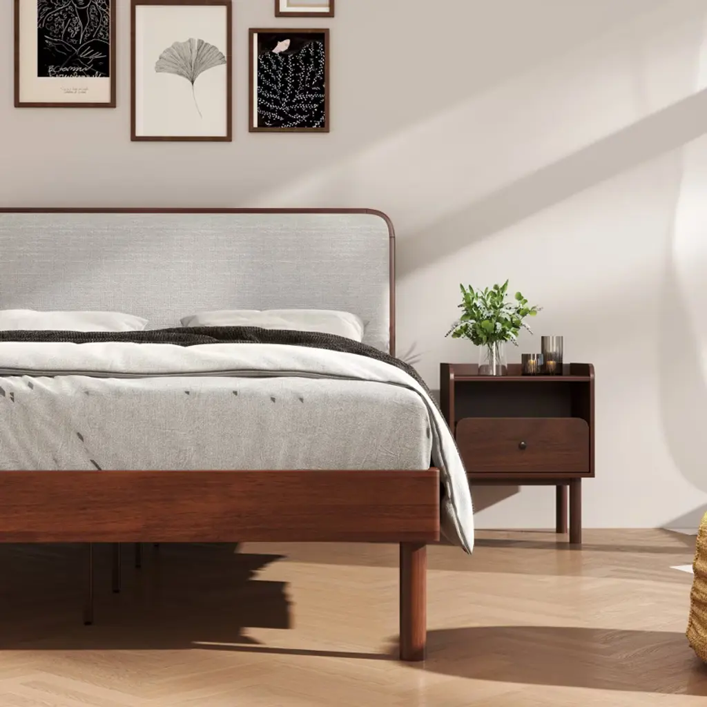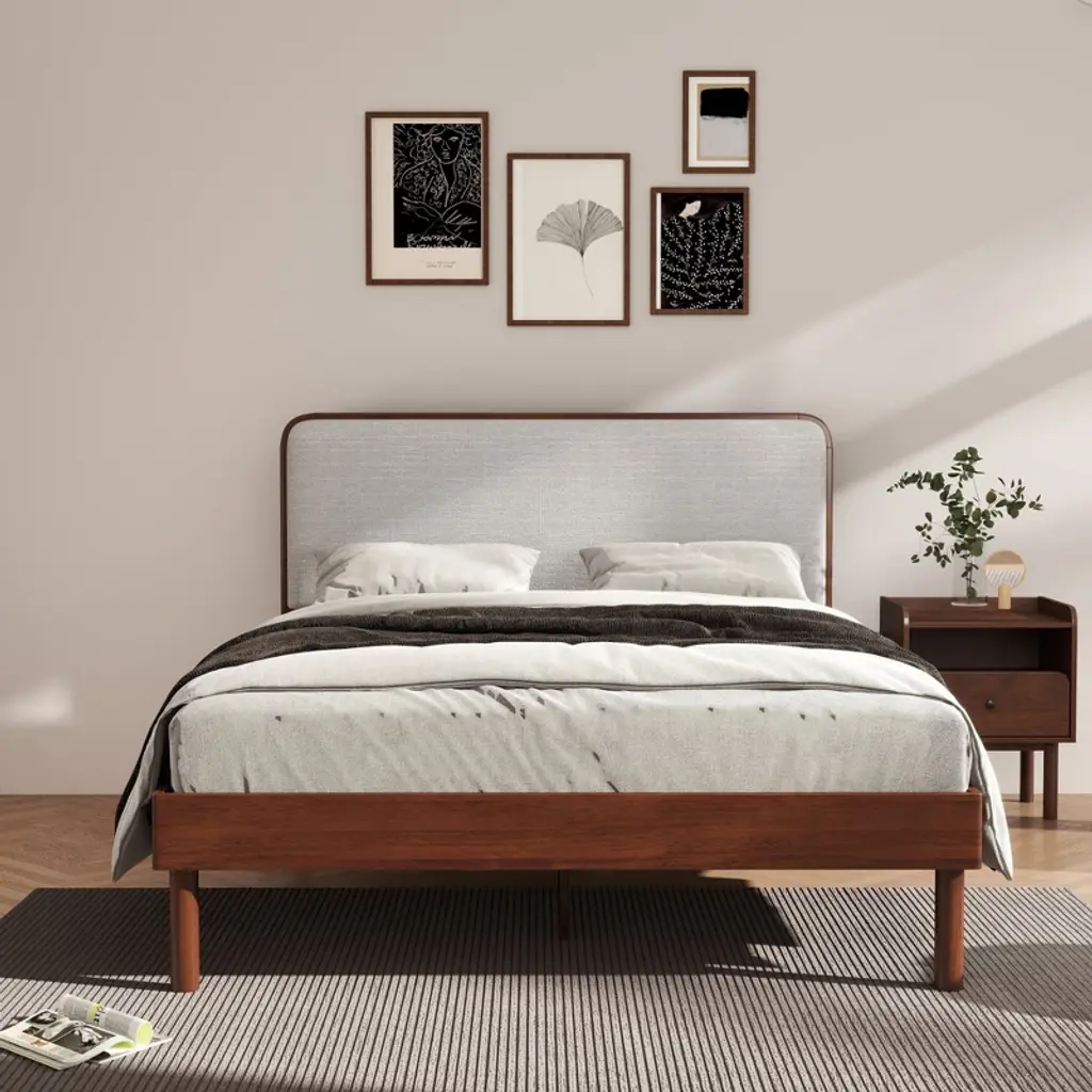 Meet the Wyller 2-Piece Bedroom Set by Roundhill Furniture, a fusion of modern luxury and artisanal craftsmanship. This set includes a bed and a nightstand. Its upholstered headboard is wrapped in breathable fabric, offering cloud-like comfort and understated elegance. With a rich natural walnut finish and tapered cylindrical legs, it creates an appealing and fresh look. Crafted from durable rubberwood, this bed ensures lasting durability. A matching nightstand completes the set, featuring a dual-tier design that offers versatile storage for your essentials. The nightstand is constructed from rubberwood and MDF in the same finish, making it a stylish and practical addition to your bedroom. No box spring is required. Upgrade your bedroom with the Wyller Collection today!