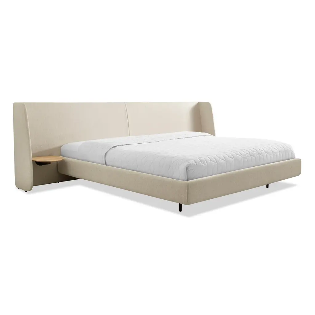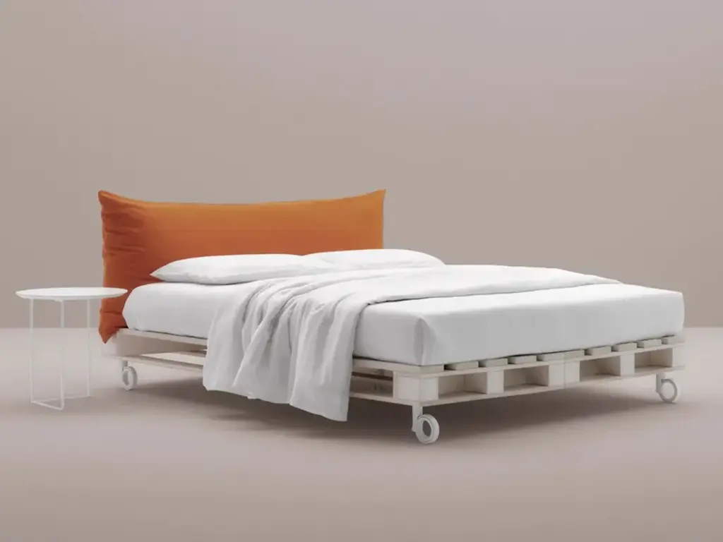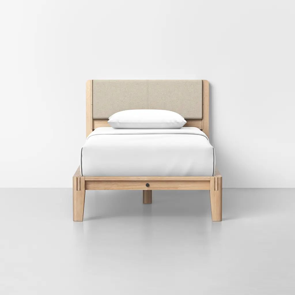 Spruce bed with removable cover on castors with upholstered headboard.Mattress not included