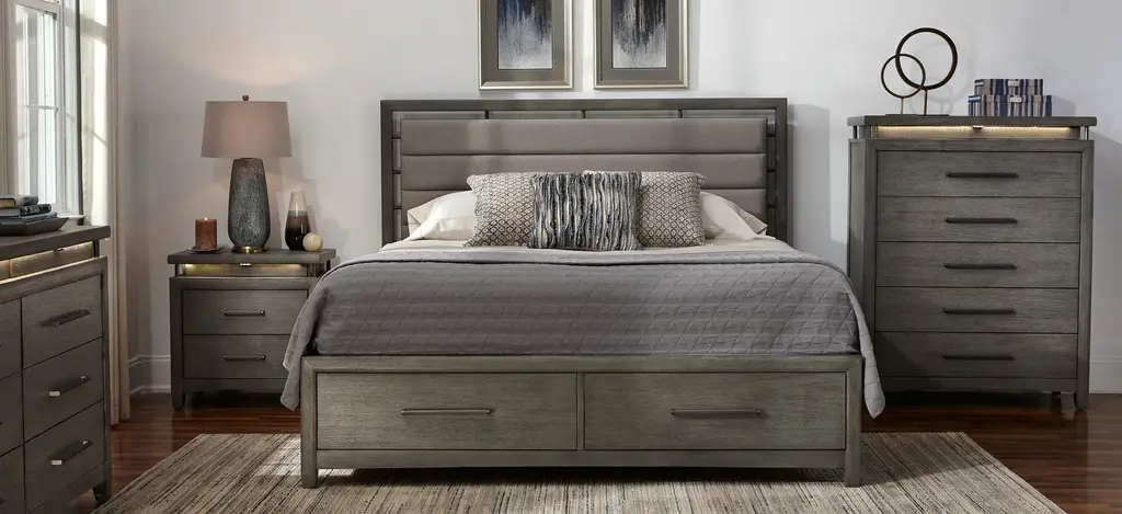Want a truly stunning master suite? The San Clemente 4-pc. Platform Storage Bedroom Set can give you just that. This modern collection features stunning oak veneers, and touch lighting on the dresser and nightstand. Plus, the nightstand's built-in USB port offers incredible convenience.