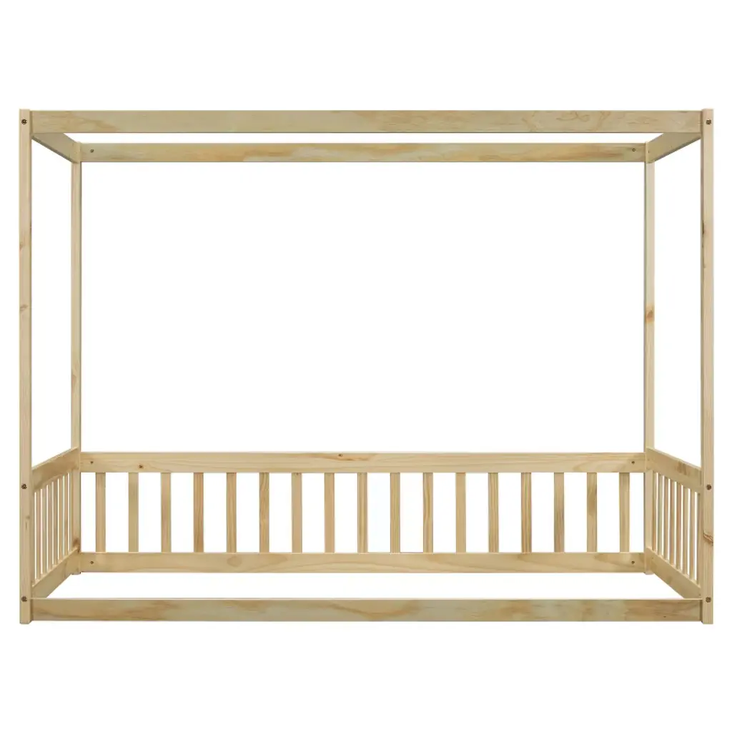 This floor bed features a wooden canopy frame that can be decorated with curtains or ornaments for a dreamy vibe. Its guardrails enhance stability, fit standard floor-placed mattresses, and ensure safe sleep. Made of premium pine wood, the sturdy structure offers lasting durability. With guardrails on three sides and an open side for easy access, it creates a private space for play and reading. Shipped in one package with a manual and hardware, assembly is easy. Recommended for thin mattresses, it blends aesthetics and practicality to provide a safe, cozy space for rest and activities.