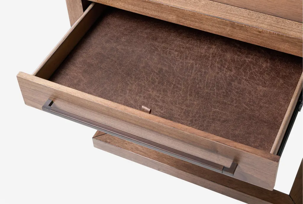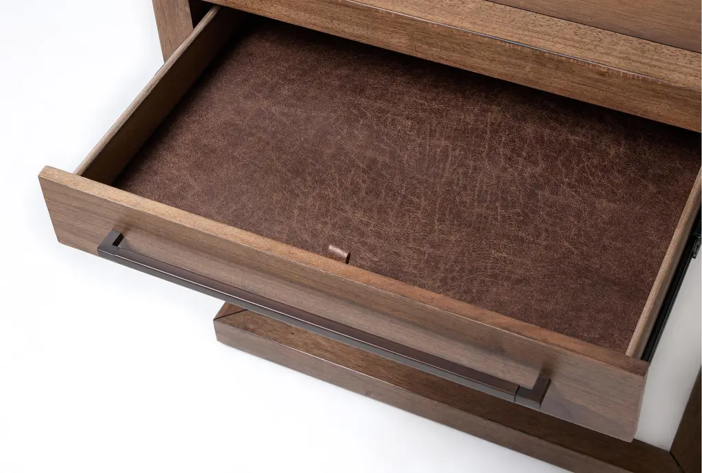Enhance your bedroom with the modern Sawyer Brown Walnut Queen Wood & Upholstered Storage Bedroom Set. This stylish set combines medium walnut wood with faux leather accents, offering both beauty and practicality. Designed with ample storage, USB ports, and LED lights, this bedroom set ensures your space is both functional and chic.