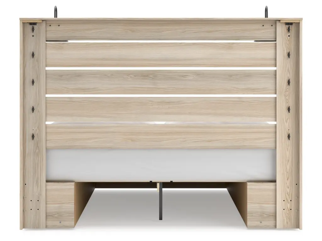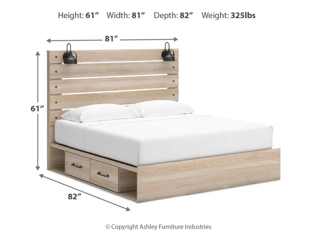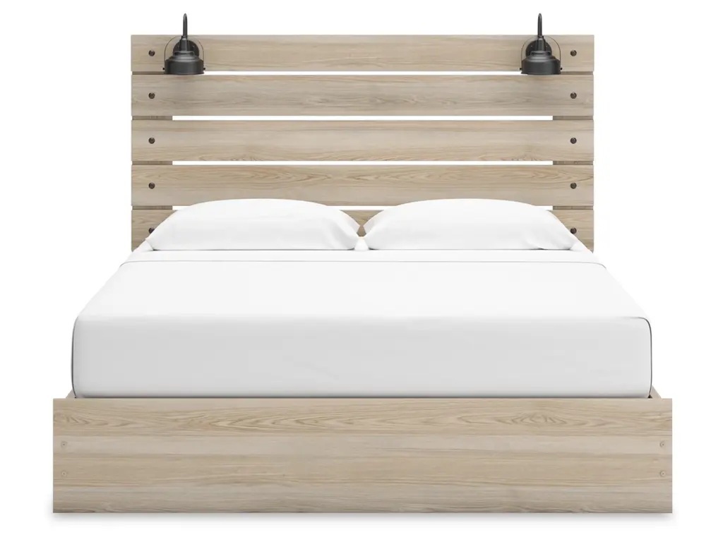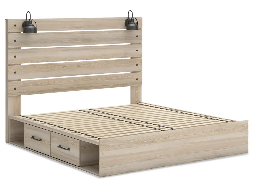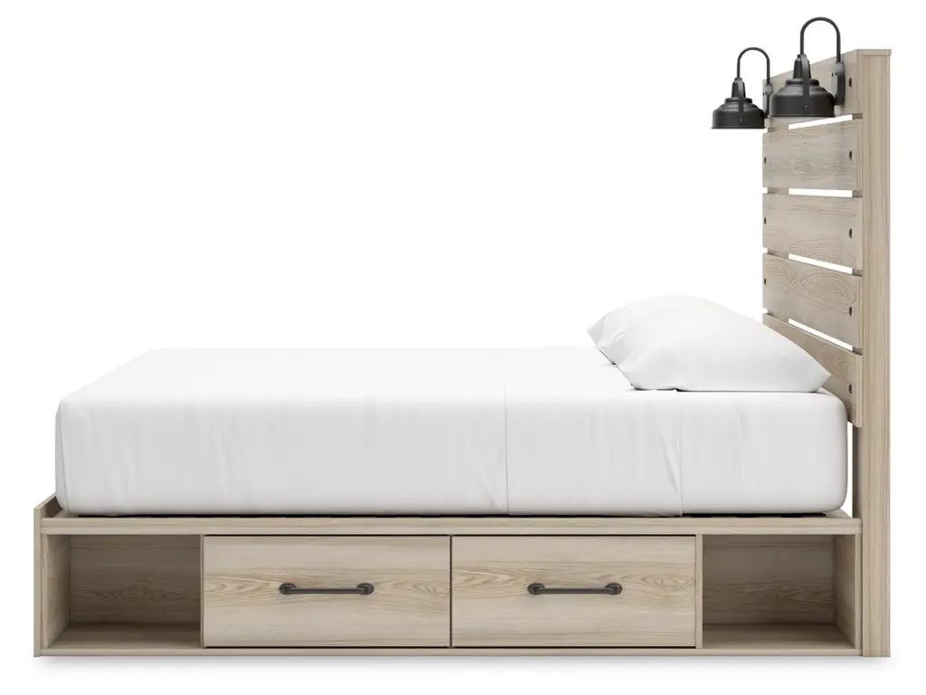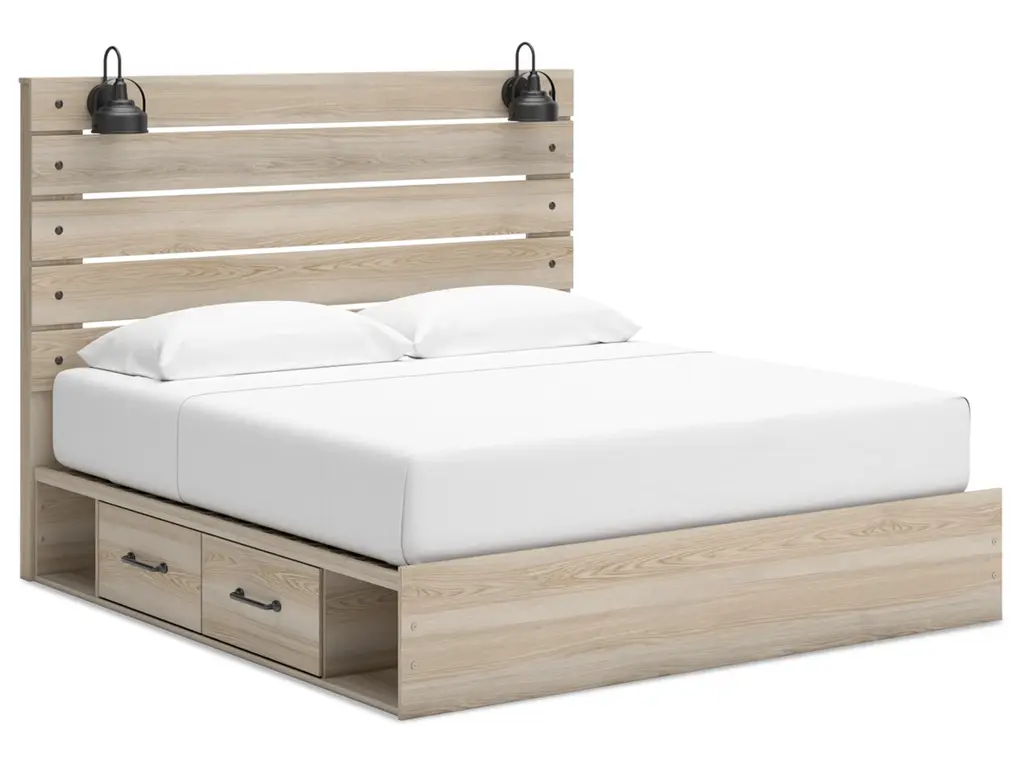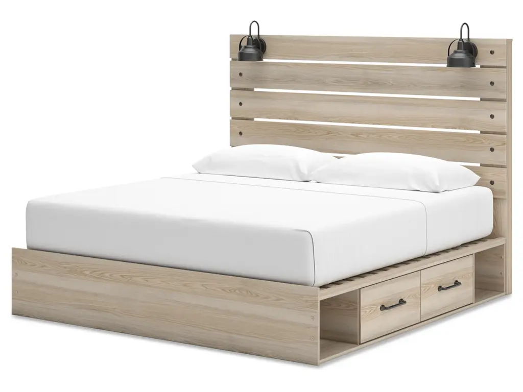When merged in just the right way, rustic and industrial styles can make one happy marriage. Case in point: the Senbry king panel bed with storage. It offers a refined take on barn board beauty, with subtle replicated wood grain showcasing a natural finish for a sense of authenticity. Love to read in bed? You’re sure to find that the headboard's retro-chic light sconces and integrated USB charging are such bright ideas. Underneath the bed are smooth-gliding drawers, along with open cubbies.