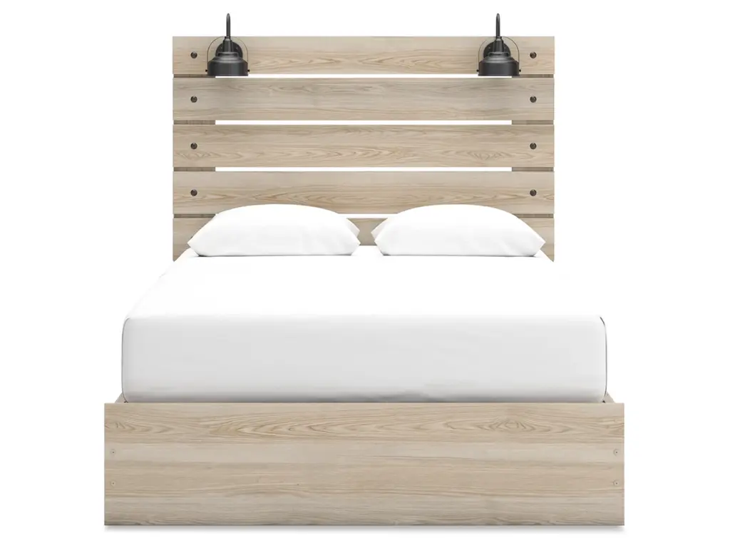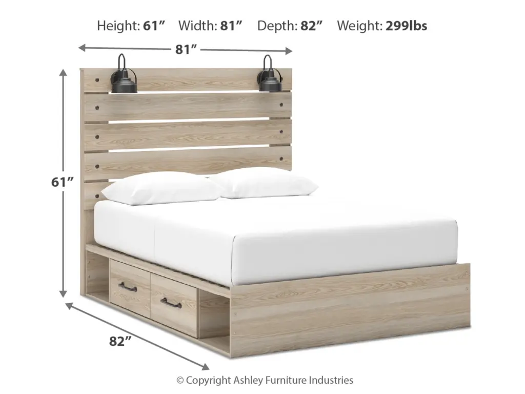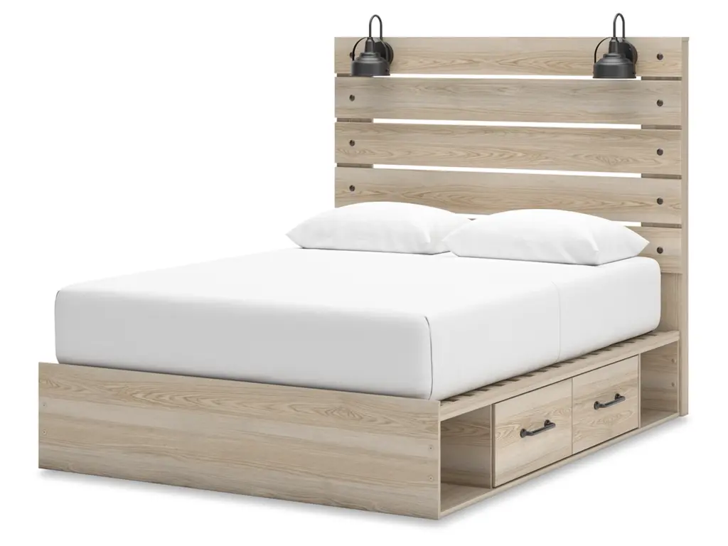 When merged in just the right way, rustic and industrial styles can make one happy marriage. Case in point: the Senbry queen panel bed with storage. It offers a refined take on barn board beauty, with subtle replicated wood grain showcasing a natural finish for a sense of authenticity. Love to read in bed? You’re sure to find that the headboard's retro-chic light sconces and integrated USB charging are such bright ideas. Underneath the bed are smooth-gliding drawers, along with open cubbies.