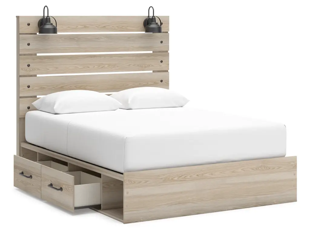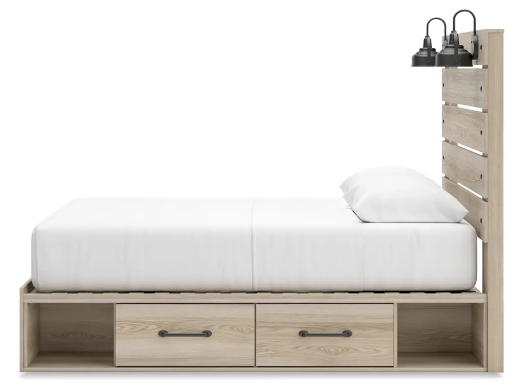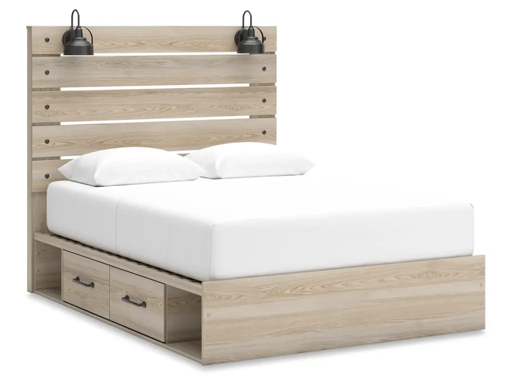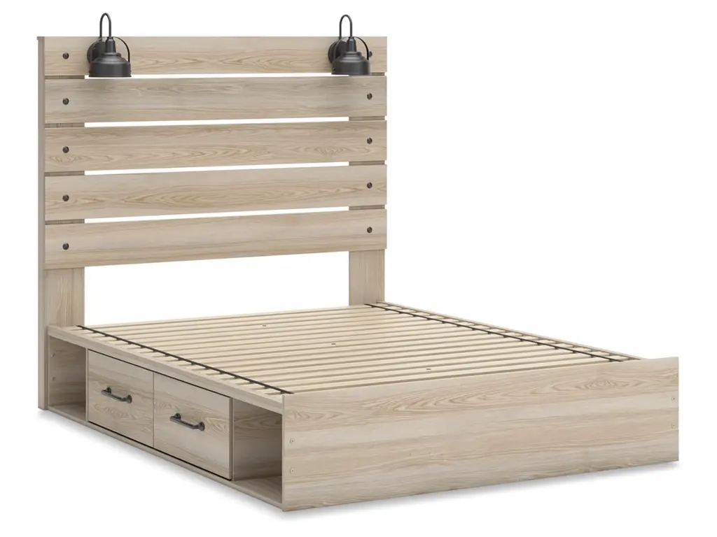 When merged in just the right way, rustic and industrial styles can make one happy marriage. Case in point: the Senbry queen panel bed with storage. It offers a refined take on barn board beauty, with subtle replicated wood grain showcasing a natural finish for a sense of authenticity. Love to read in bed? You’re sure to find that the headboard's retro-chic light sconces and integrated USB charging are such bright ideas. Underneath the bed are smooth-gliding drawers, along with open cubbies.