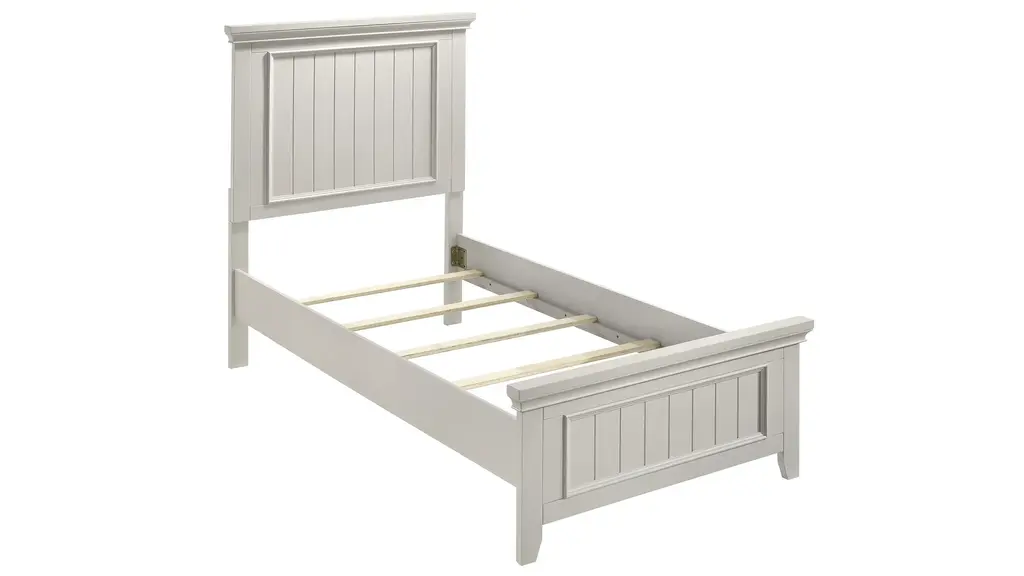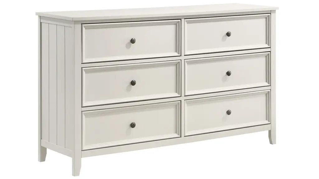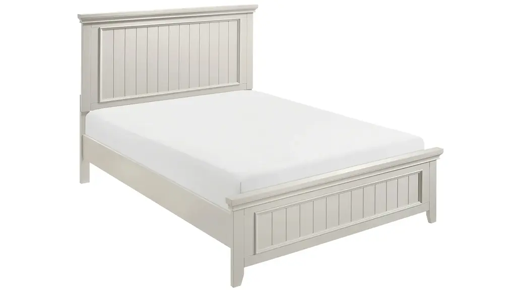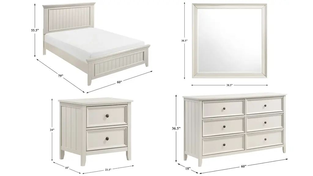 Hints of farmhouse living create the look of the Serena 4pc. Bedroom Set. The white finish of the collection is a subtle canvas for your bedroom's d_cor. Framed shiplap-inspired panels lend a classic decorative accent to each piece in the collection. Knob hardware fronts the drawers of the dresser and nightstand.