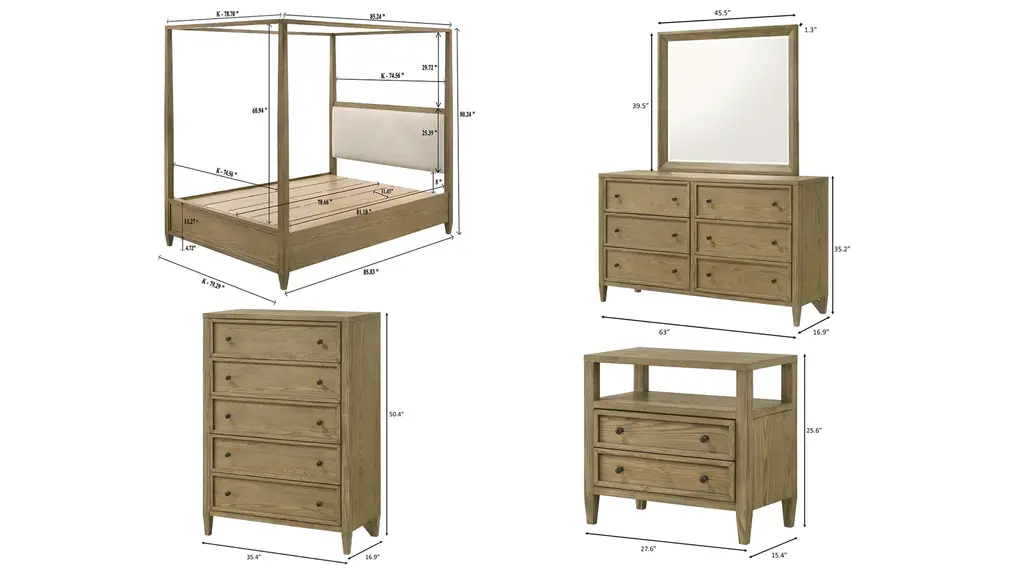 Transform your bedroom into a masterpiece with the Sienna 5-pc. Bedroom Set. The focal point, a stunning canopy bed, adds a touch of grandeur to any space. Its clean lines make this transitional bedroom effortlessly blend with various room d_cors. Functional and elegant case pieces complete the ensemble, promising years of enjoyment in your sanctuary. Elevate your bedroom to new heights of sophistication with the timeless allure of Sienna.