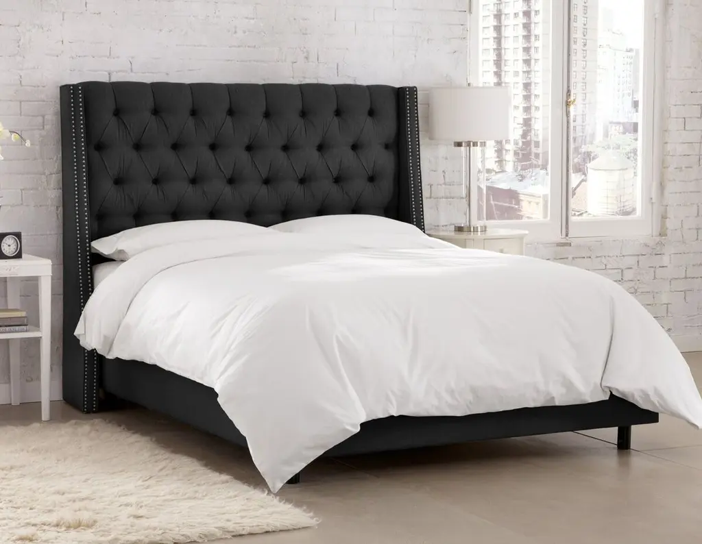 This chic wingback bed sets a tone of sophistication for any bedroom. Its Talc Linen upholstery is accented with deep, diamond tufting for added character. Mattress and box spring required. Handcrafted in the USA.