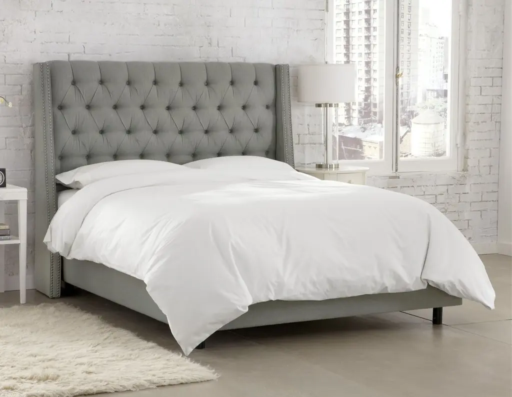 This chic wingback bed sets a tone of sophistication for any bedroom. Its Talc Linen upholstery is accented with deep, diamond tufting for added character. Mattress and box spring required. Handcrafted in the USA.