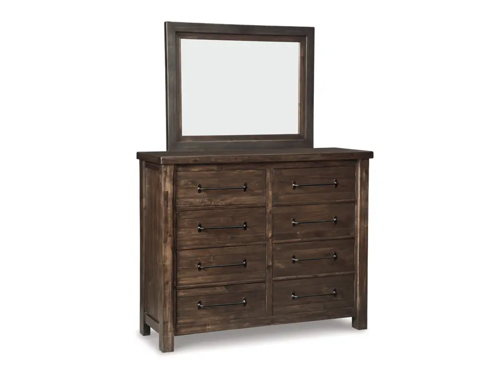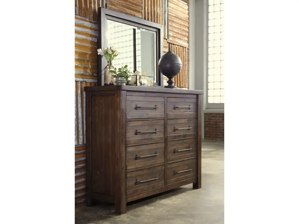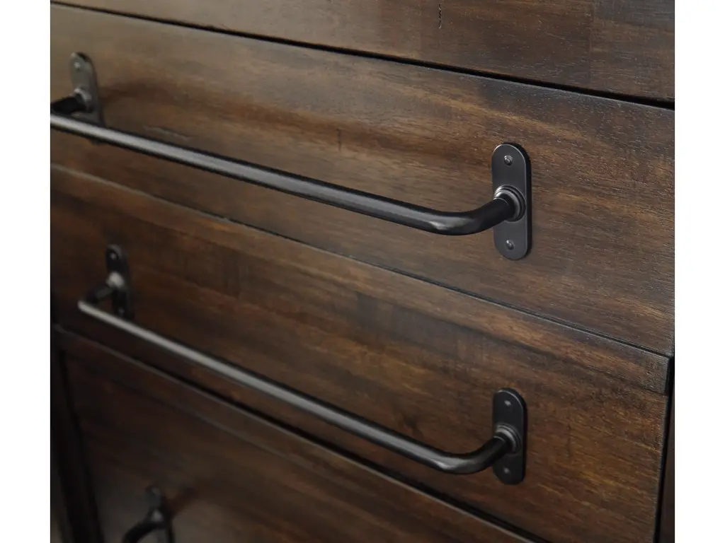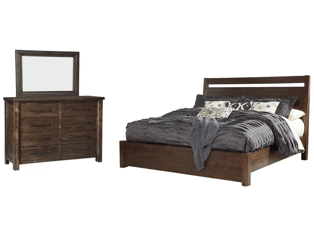 For fans of urban industrial design, the Starmore king bedroom set clearly steals the show. Its blend of acacia veneer and wood is beautified with an oiled walnut-tone finish for a highly contemporary aesthetic with natural, grainy character. Open plank detailing on the headboard and low-profile footboard perfect the look from head to toe. Eight-drawer dresser with dovetail construction and cool linear pulls melds exceptional form and function. Mattress and foundation/box spring available, sold separately.