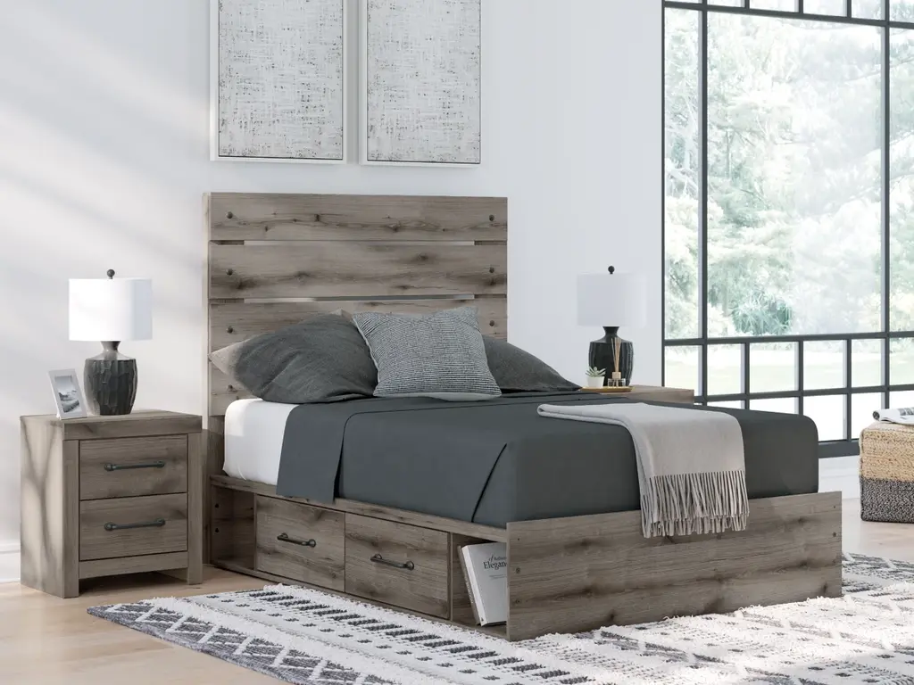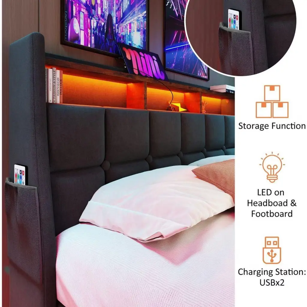 This queen-sized upholstered bed with LED lighting features a vintage-modern design, USB charging port, under-bed storage, and sturdy slatted frame. Assembly required.