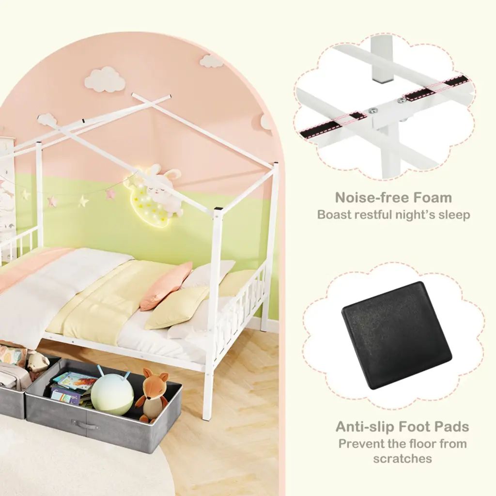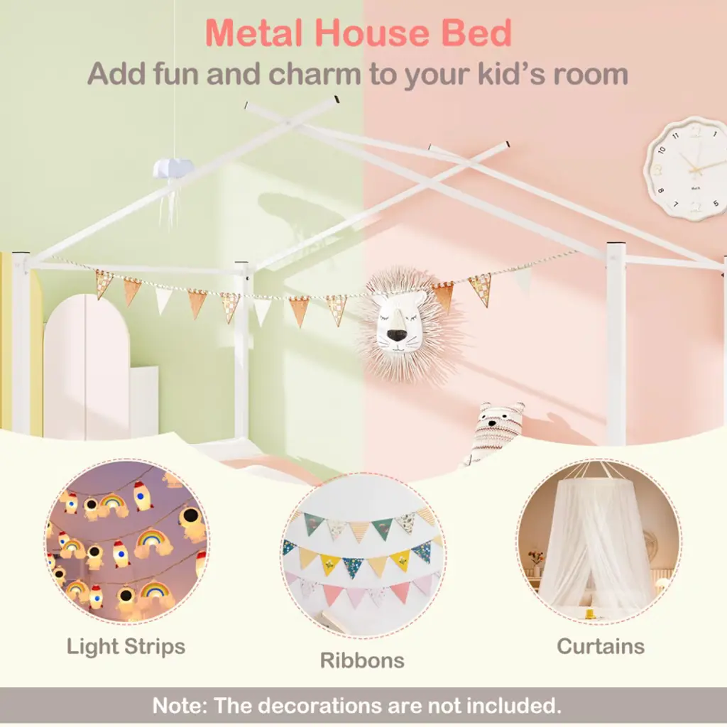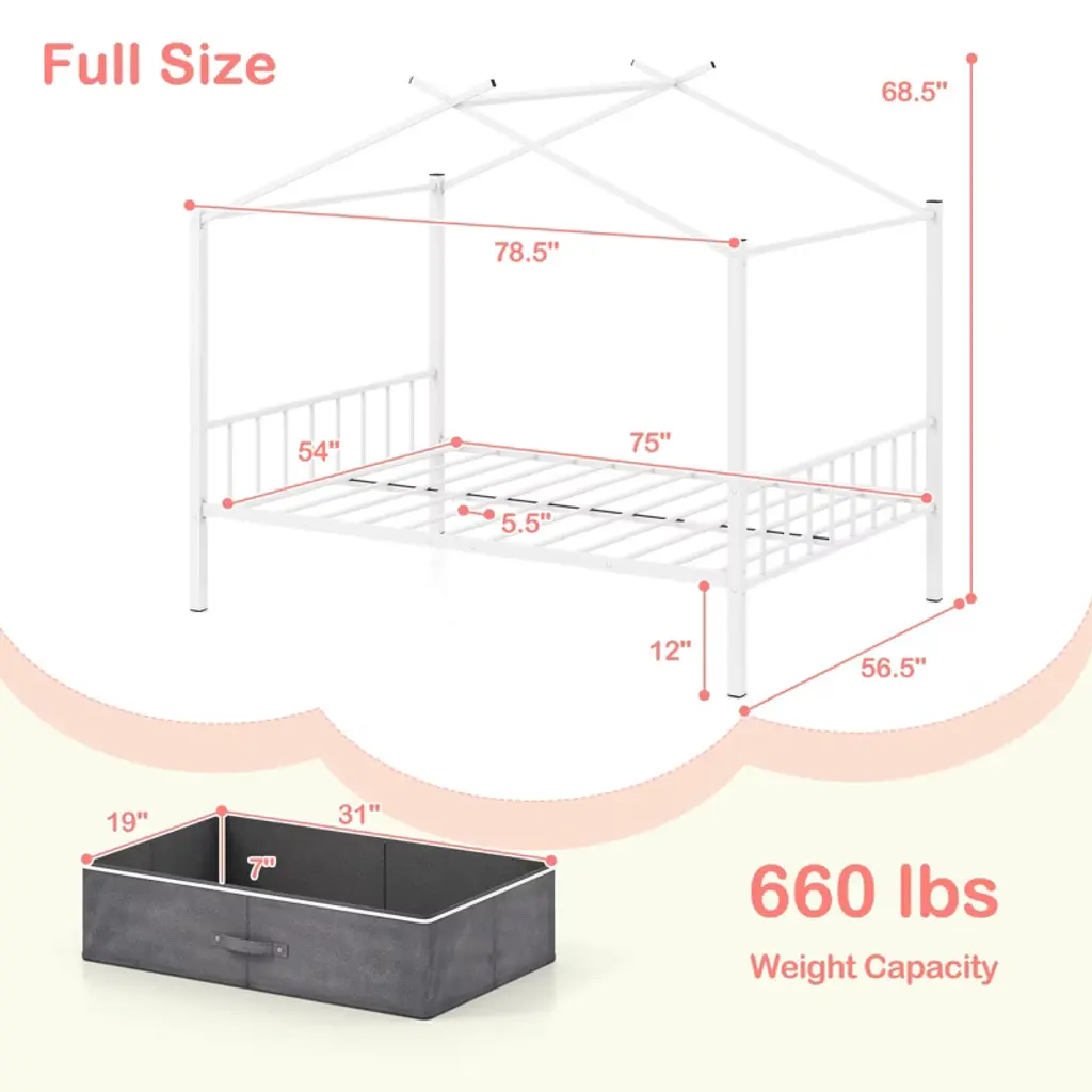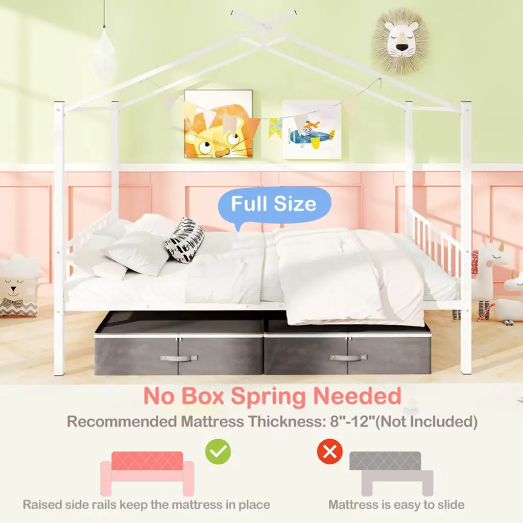 Transform your child's bedroom into a cozy retreat! This full metal house bed features a charming roof design that sparks imagination and encourages play. For storage convenience, the foldable fabric drawers help keep room neat and organized. Constructed from heavy-duty metal slats, the platform bed is built to last and provides strong support for a mattress. The structure is reinforced with middle support legs, enhancing stability and ensuring a robust weight capacity of 660 lbs. The noise-free foam on the slats minimizes any creaking sounds. Perfect for boys and girls, this house-shaped bed frame will bedtime an adventurous affair.FeaturesMetal house bed adds fun and charm to your kid's room 2 foldable fabric drawers keep items organized and clutter-free Convenient handle and smooth zipper for opening and closing the drawersSpecifications:Color: Black / White Material: Metal, Fabric Overall Dimensions: 78.5" x 56.5" x 68.5" (L x W x H) Dimensions of Drawers: 31" x 19" x 7" (L x W x H) Bed Surface: 75" x 54" (L x W) Distance Between Slats: 5.5" Height of Under-bed Space: 12" Recommended Mattress Thickness: 8"-12"(not included) Weight Capacity of Bed: 660 lbs Net Weight: 58 lbs Note: The decorations are not included. Package Includes: 1 x Metal House Bed 1 x Instruction