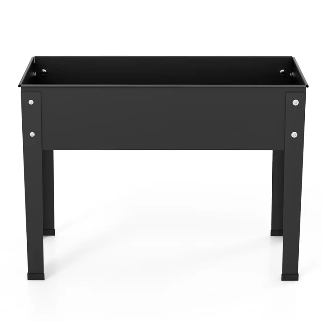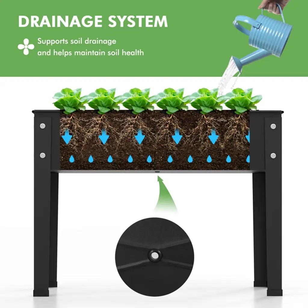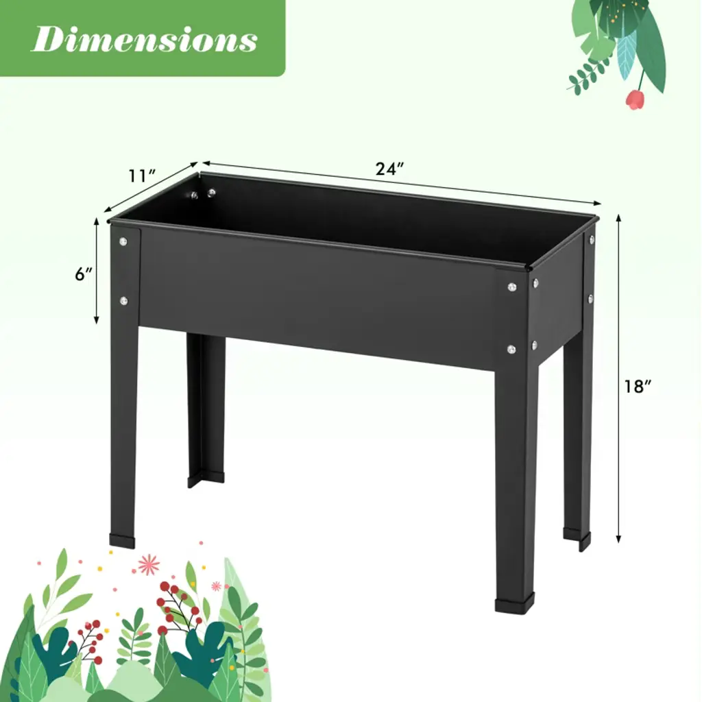 The raised garden bed is a stylish way to plant and decorate your outside space. Constructed of powder-coated metal frame with screw connection, the raised garden bed is extremely sturdy and resistant to rust, suitable for long time outdoor indoor use. The gardening container is roomy enough to grow various vegetables, herbs, flowers and plants. There is a drain hole of the garden bed that can help prevent root rot and water logging, allow better water penetration, maintain soil moisture, give plants better growth conditions. This 18" high elevated planter box with legs makes gardening convenient and protects plants from pets. This metal raised bed for gardening can be used both indoors and outdoors, which is suitable for garden, backyard, balcony, and other places. This black planter box will make an eye-catching addition to your garden or yard.FeaturesMade of coated metal plate featuring good durability for a long time use4 supporting legs keep the planter box more stable and will not bendProvide ample growing space to raise herbs, flowers, vegetables and moreDrainage system supports soil drainage and helps maintain soil health18" high elevated design well protects your plants from animalsPerfect for using in the balcony, garden, backyard or indoorsSimple stylish appearance blends well with the view of gardenSpecifications: Color: Black Material: Metal Overall Dimensions: 24" x 11" x 18" (W x D x H) Interior Size: 23" x 10" x 5.5" (W x D x H) Weight Capacity: 44 lbs Net Weight: 7.5 lbs Package Includes: 1 x Elevated Metal Planter Box 1 x User's Manual