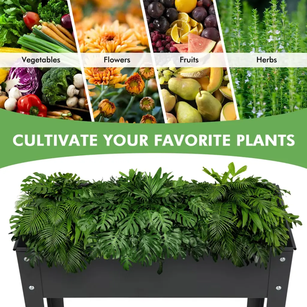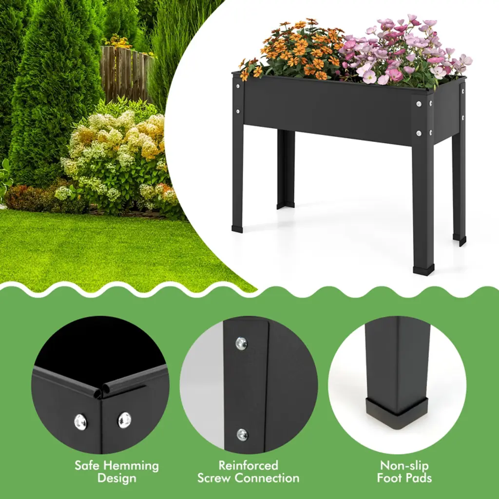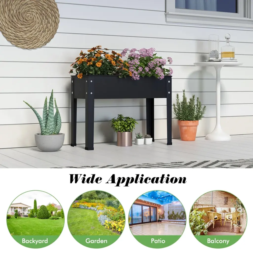 The raised garden bed is a stylish way to plant and decorate your outside space. Constructed of powder-coated metal frame with screw connection, the raised garden bed is extremely sturdy and resistant to rust, suitable for long time outdoor indoor use. The gardening container is roomy enough to grow various vegetables, herbs, flowers and plants. There is a drain hole of the garden bed that can help prevent root rot and water logging, allow better water penetration, maintain soil moisture, give plants better growth conditions. This 18" high elevated planter box with legs makes gardening convenient and protects plants from pets. This metal raised bed for gardening can be used both indoors and outdoors, which is suitable for garden, backyard, balcony, and other places. This black planter box will make an eye-catching addition to your garden or yard.FeaturesMade of coated metal plate featuring good durability for a long time use4 supporting legs keep the planter box more stable and will not bendProvide ample growing space to raise herbs, flowers, vegetables and moreDrainage system supports soil drainage and helps maintain soil health18" high elevated design well protects your plants from animalsPerfect for using in the balcony, garden, backyard or indoorsSimple stylish appearance blends well with the view of gardenSpecifications: Color: Black Material: Metal Overall Dimensions: 24" x 11" x 18" (W x D x H) Interior Size: 23" x 10" x 5.5" (W x D x H) Weight Capacity: 44 lbs Net Weight: 7.5 lbs Package Includes: 1 x Elevated Metal Planter Box 1 x User's Manual