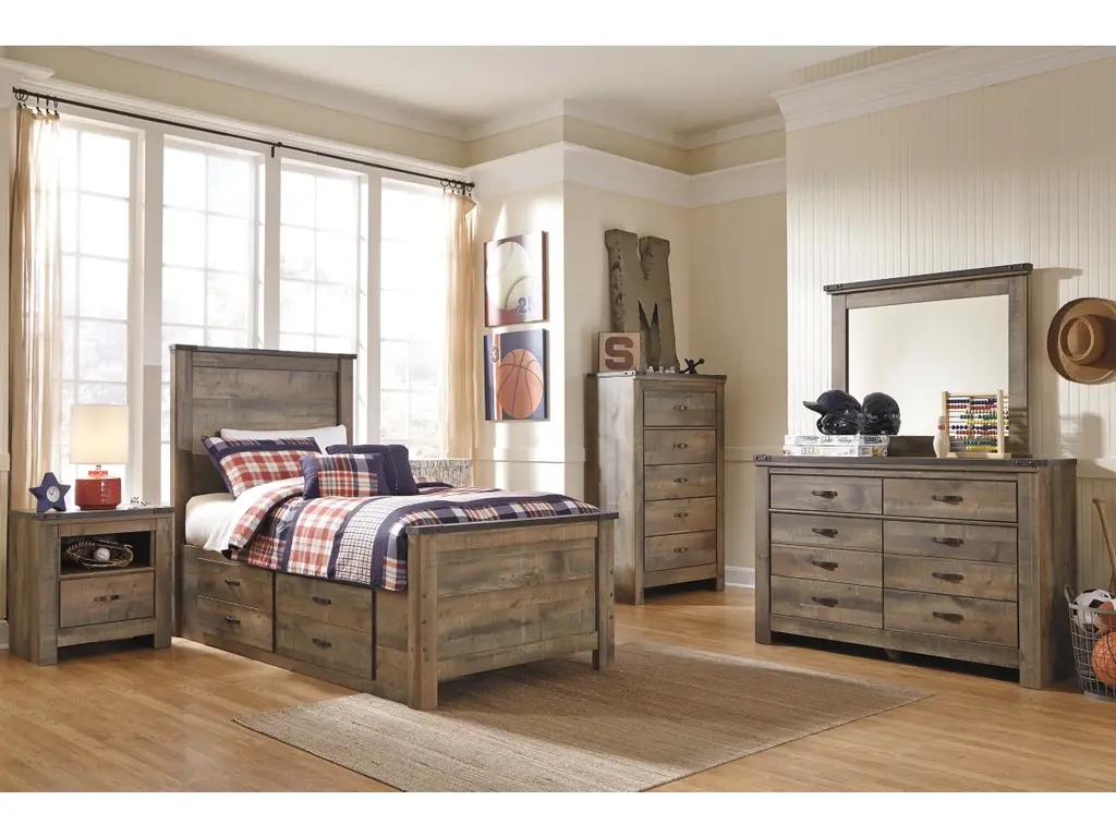 Whether she loves horses or he's a cowboy at heart, the Trinell twin panel bed with under bed storage matches their authenticity. Its rustic finish, plank-style details and nailhead trim pay homage to reclaimed barn wood, making for a chic look loaded with charm. Mattress available, sold separately.