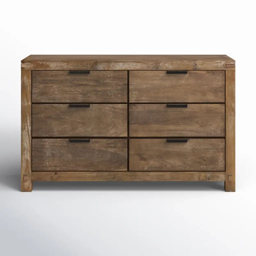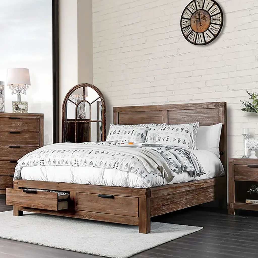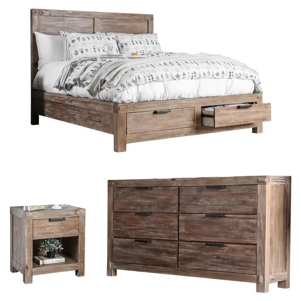 This configurable 4-piece bedroom set has the key ingredients to any traditional farmhouse bedroom or master suite: a low-profile bed, nightstand, dresser, and chest. Each bedroom furniture piece is crafted from sturdy solid wood and veneers that are distressed to highlight the wood's natural wood grain (knots and all). Well-made moldings and a weather-worn oak finish give this bedroom set all the character of a piece of antique furniture. Looks aside, the bed has built-in drawers and comes in the size of your choice with a panel headboard and footboard, so no need to fret over extra purchases (besides the mattress you'll need to buy separately). The included nightstand has a spacious drawer and lower shelf for tidying up books, remotes, and other bedroom essentials, while the 5-drawer chest and 6-drawer dresser give you plenty of room for clothes or linens you'd like to tuck away. Just keep in mind that you'll need to assemble this bedroom furniture set, so be sure to have a screwdriver (or handyman) around when the time comes.