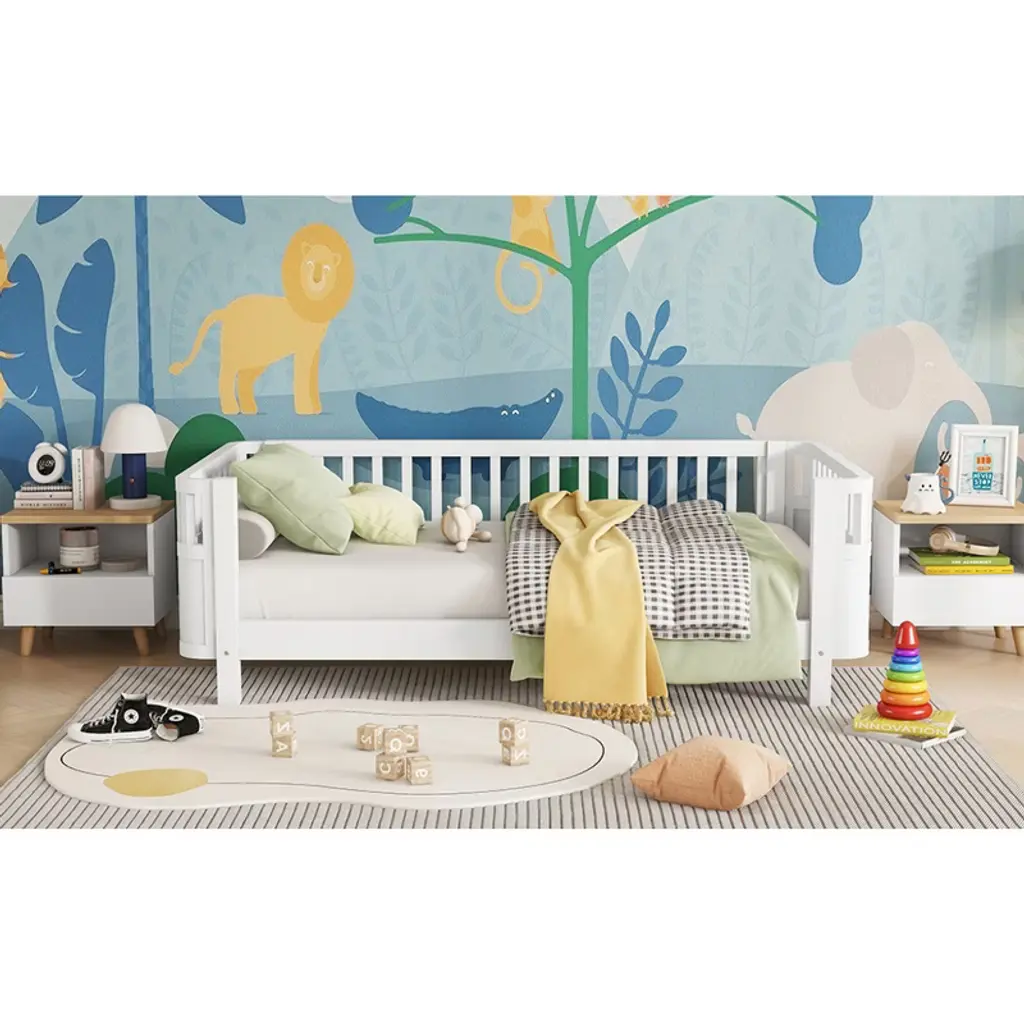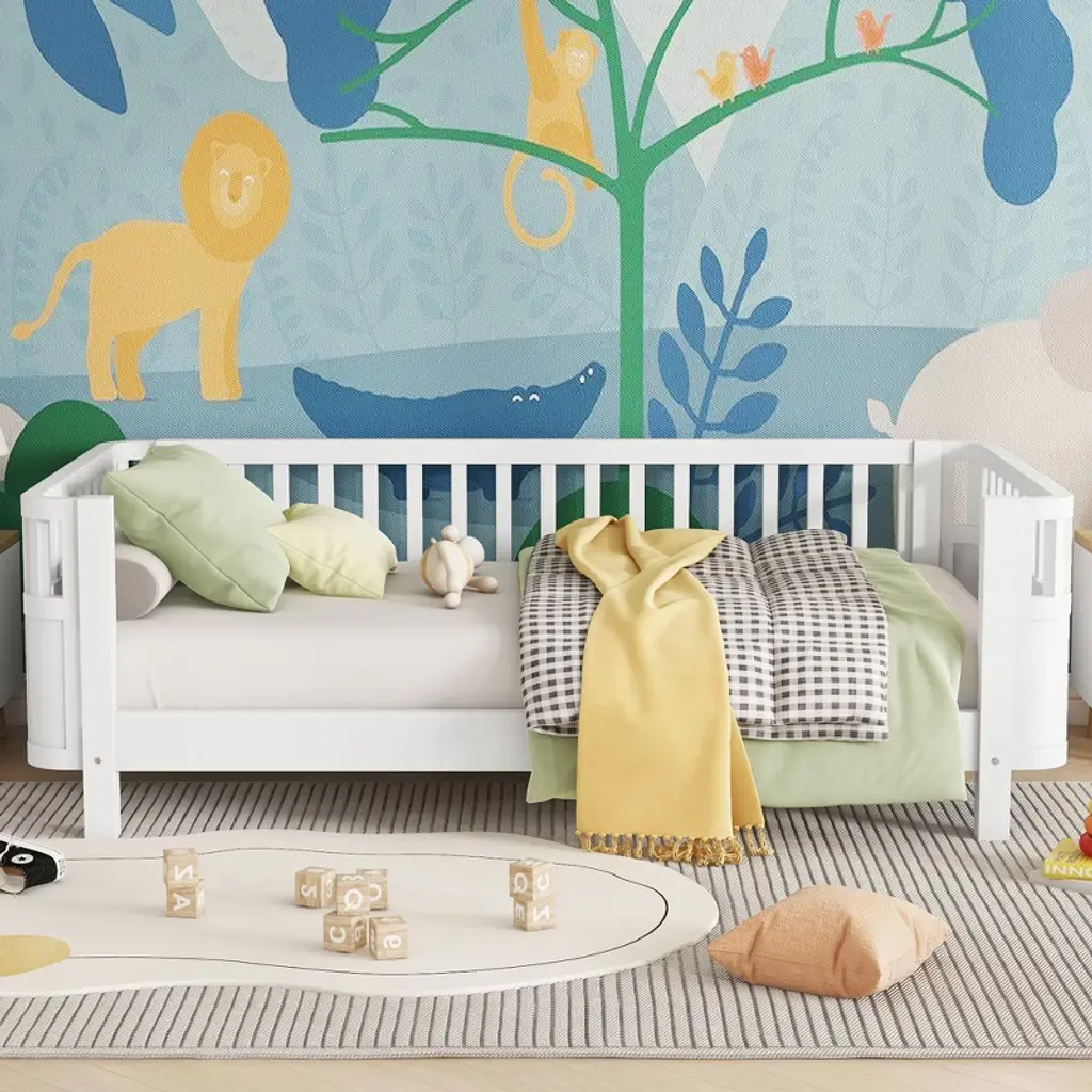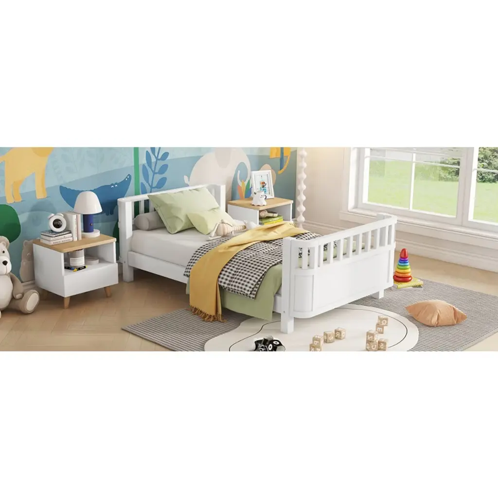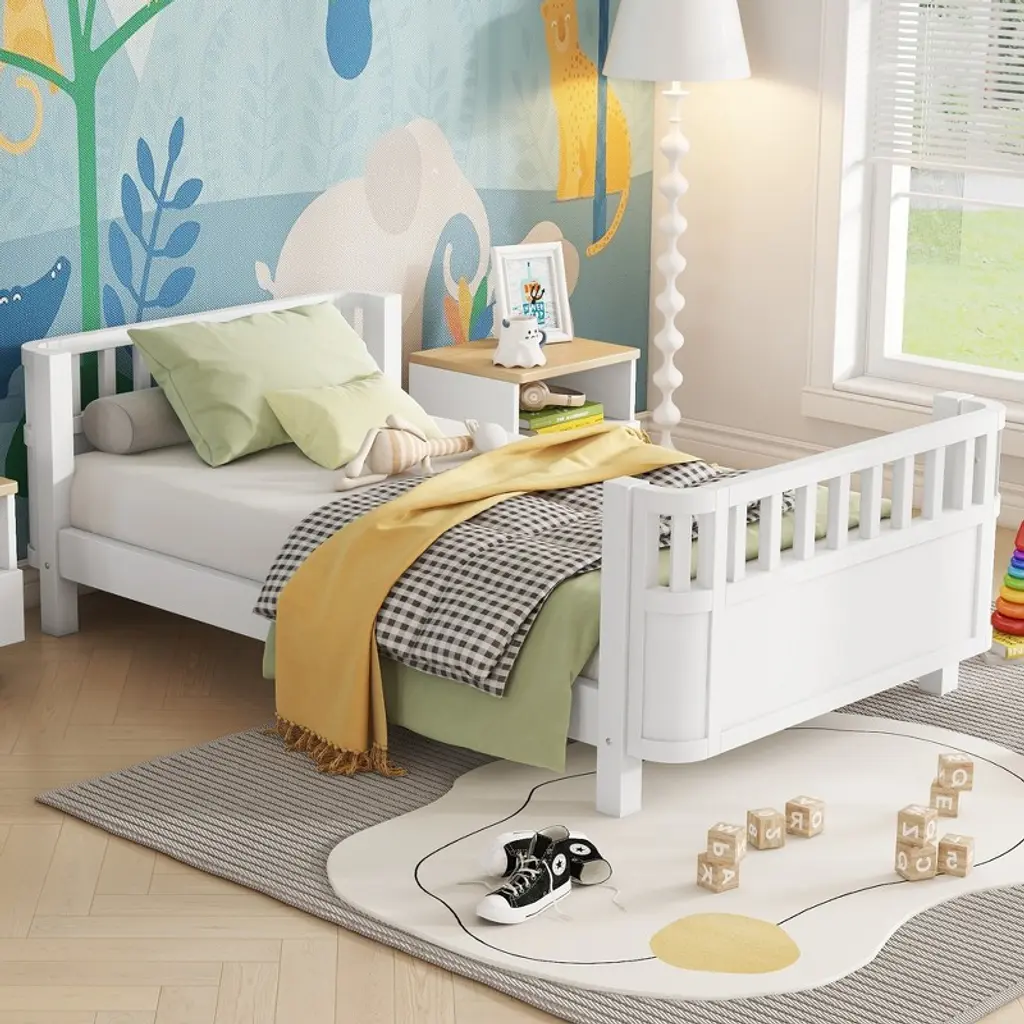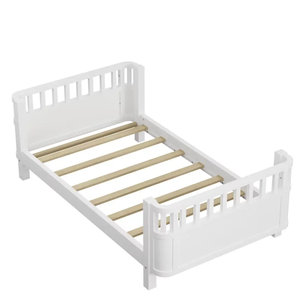 Product Features It is 5.5 inch from the kids bed frame to the floor which low design makes this twin bed easy for your child to get in and out of bed and also safety.Our twin kids bed designed with the safety of your children in mind. 4 corners of the twin bed is round shape and leg is at inside which protect your kids more safe and avoid bumps feet.The kids bed come with different use, can place the side without rails against the wall which suitable for little kids. You can also use it as a daybed or place at side of mother’s bed which more convenience for mother to take care kids. Besides, the right side rails of the bed can be taken off when no need. This design meet your growing child’s changing needs.This twin platform bed featuring fence with headboard, footboard and side to increase the safety. With 2.8 inch gap in each fence effectively preventing pinch hazard.Crafted with a sturdy wooden frame made from a combination of solid wood, plywood, and MDF. This kids twin bed is a delightful addition to any boy's or girl's room. Its modern and elegant design blends seamlessly with a variety of room themes and color schemes. Description This kids bed design with the guardrail provides safe guarantee. Constructed of solid pine wood+MDF, features a sturdy high quality solid wood construction for durability and high load capacity, ensuring longevity. Description & Dimensions Size: TwinOverall Product Dimension: 77.4*41.9*24.2”Product Weight: N.W: 52.8 LBS G.W: 60.28 LBSWeight Capacity: 250LBSRecommended Mattress Thickness: 6-8 inchNumber of Slats: 9pcsNumbers of Package: 1Box Spring Required: NoRemark: Different lighting or display will cause color different