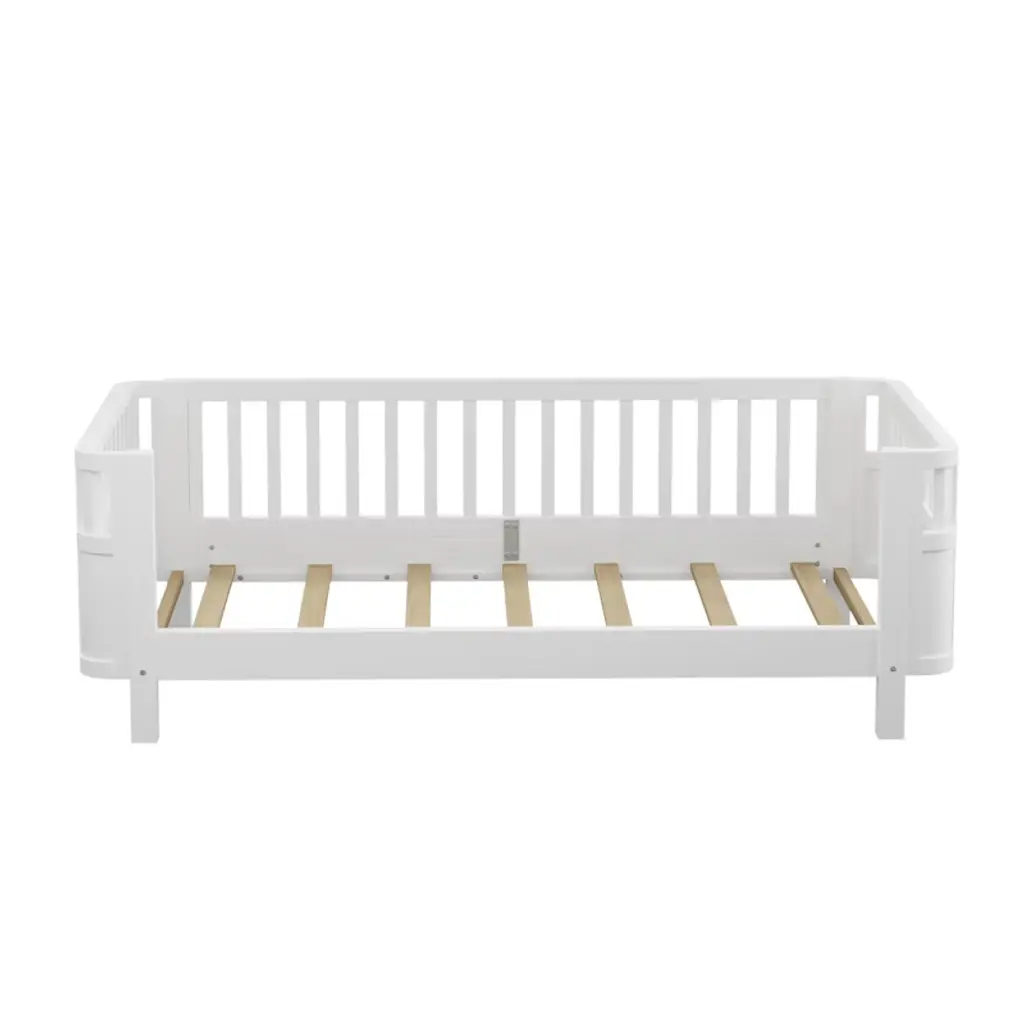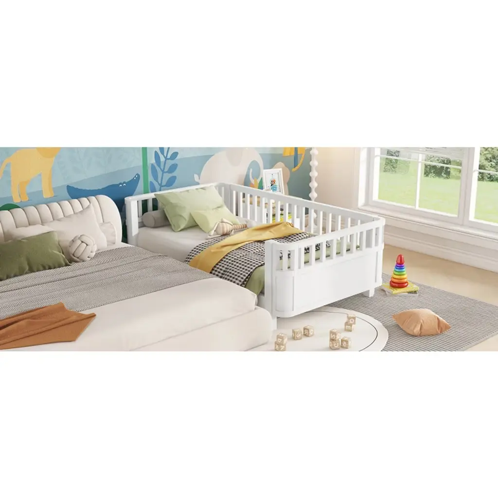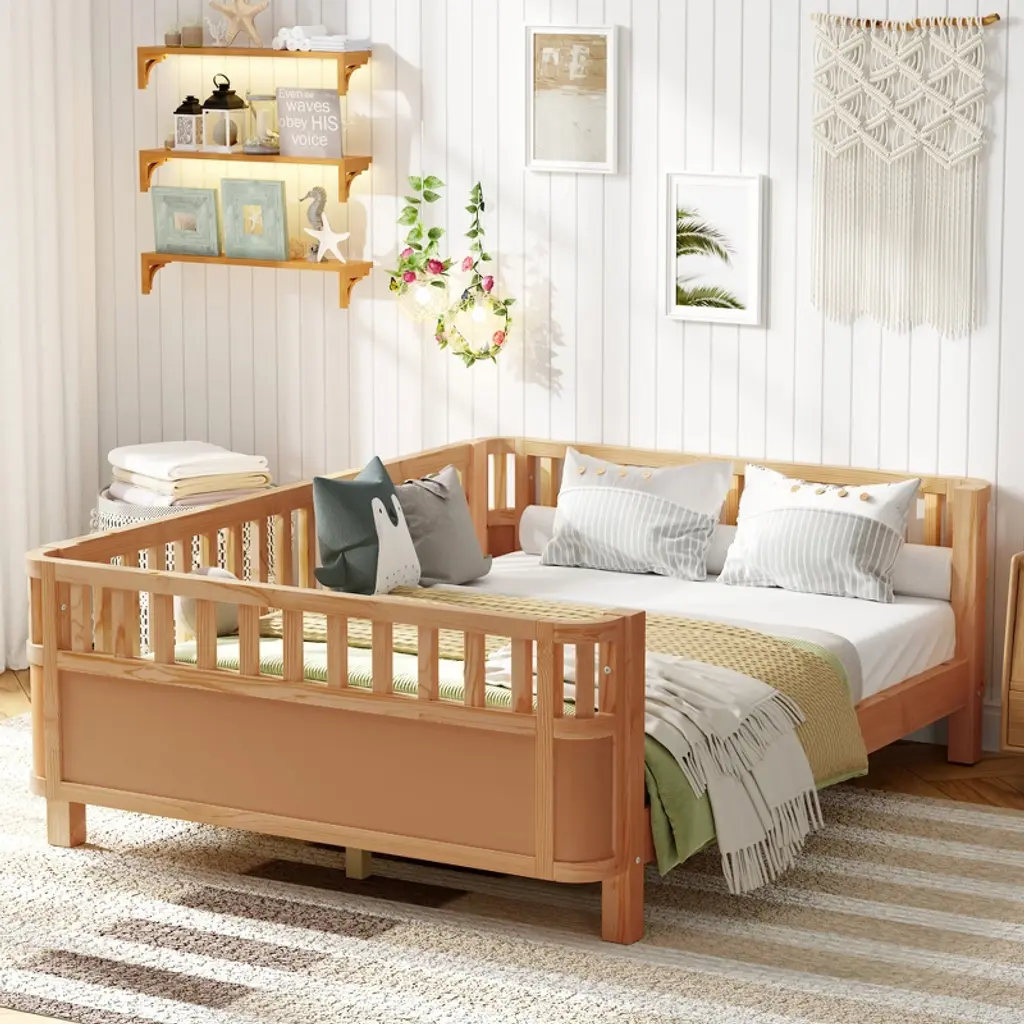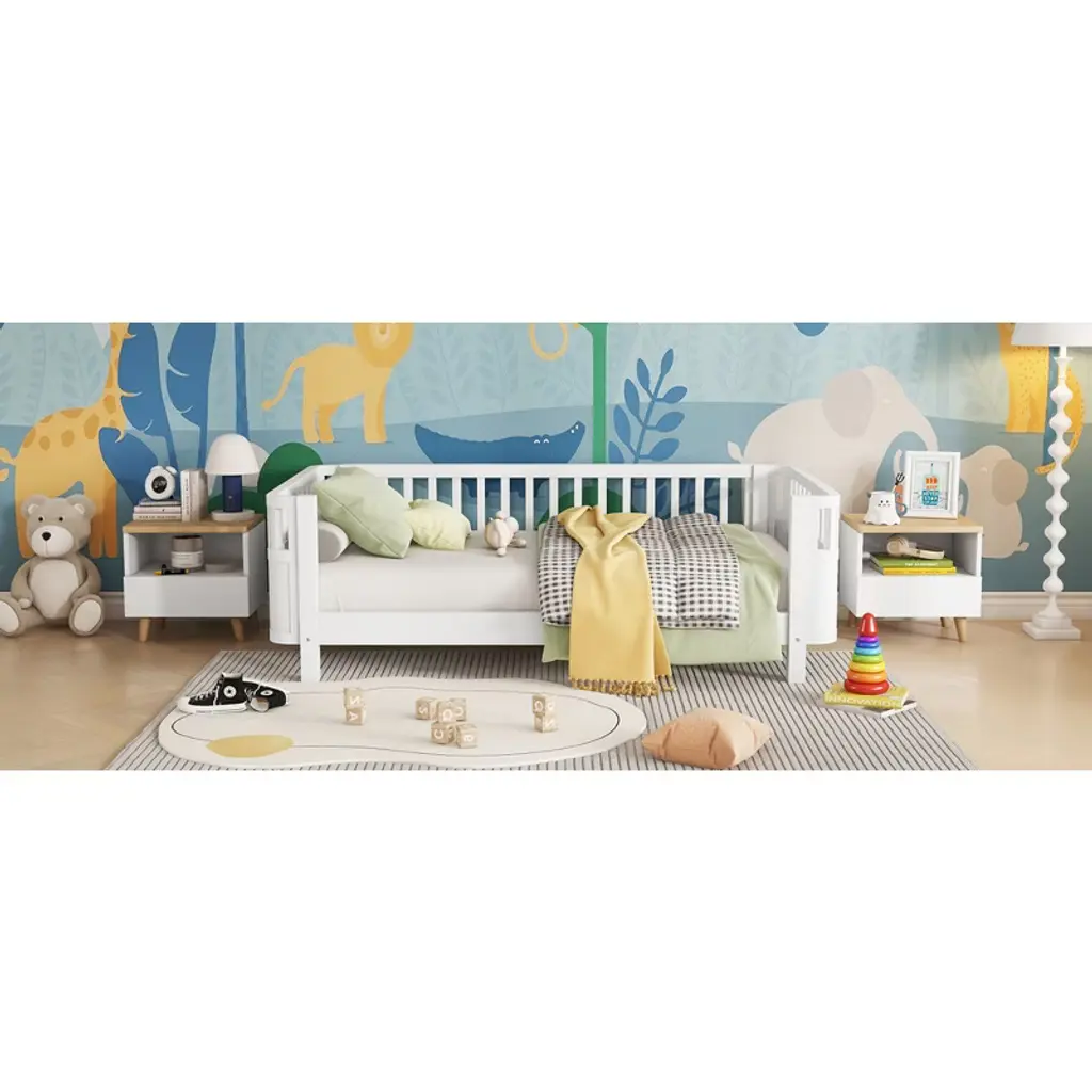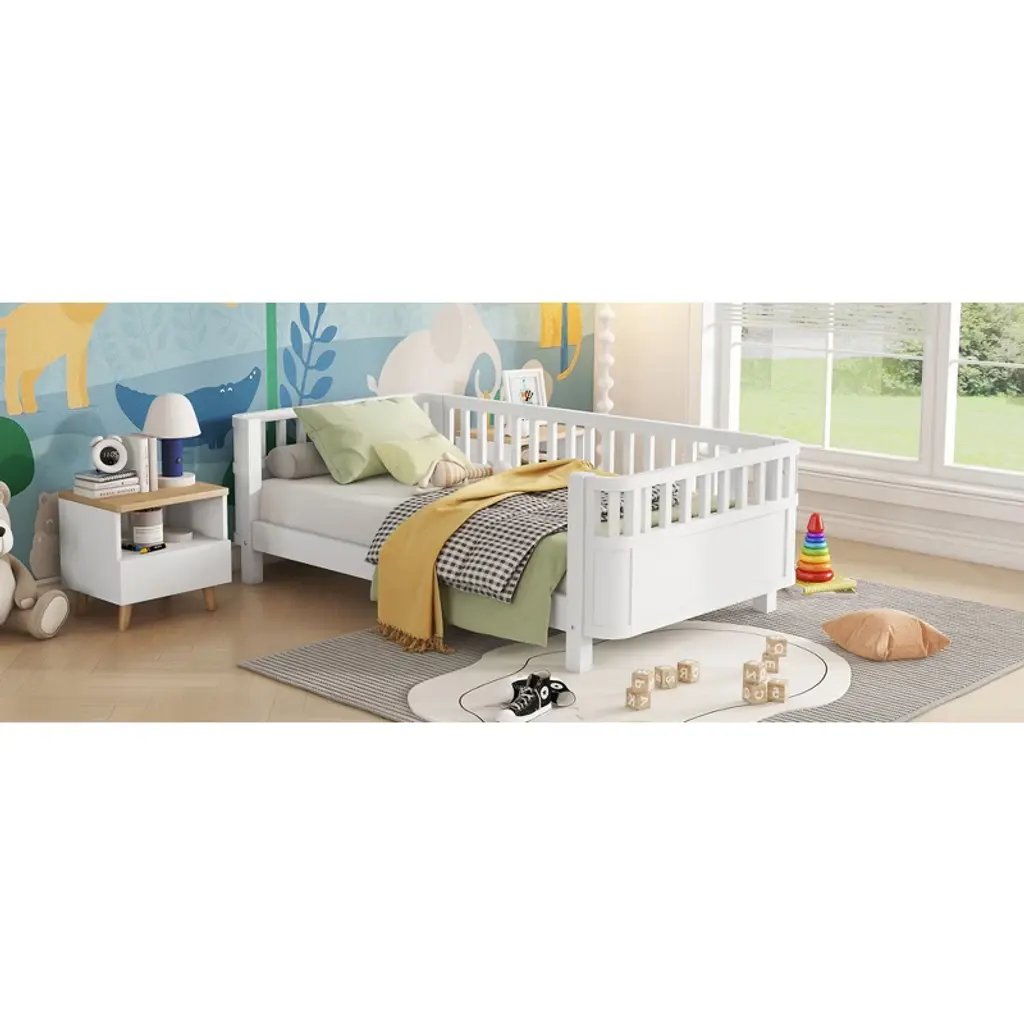 Product Features It is 5.5 inch from the kids bed frame to the floor which low design makes this twin bed easy for your child to get in and out of bed and also safety.Our twin kids bed designed with the safety of your children in mind. 4 corners of the twin bed is round shape and leg is at inside which protect your kids more safe and avoid bumps feet.The kids bed come with different use, can place the side without rails against the wall which suitable for little kids. You can also use it as a daybed or place at side of mother’s bed which more convenience for mother to take care kids. Besides, the right side rails of the bed can be taken off when no need. This design meet your growing child’s changing needs.This twin platform bed featuring fence with headboard, footboard and side to increase the safety. With 2.8 inch gap in each fence effectively preventing pinch hazard.Crafted with a sturdy wooden frame made from a combination of solid wood, plywood, and MDF. This kids twin bed is a delightful addition to any boy's or girl's room. Its modern and elegant design blends seamlessly with a variety of room themes and color schemes. Description This kids bed design with the guardrail provides safe guarantee. Constructed of solid pine wood+MDF, features a sturdy high quality solid wood construction for durability and high load capacity, ensuring longevity. Description & Dimensions Size: TwinOverall Product Dimension: 77.4*41.9*24.2”Product Weight: N.W: 52.8 LBS G.W: 60.28 LBSWeight Capacity: 250LBSRecommended Mattress Thickness: 6-8 inchNumber of Slats: 9pcsNumbers of Package: 1Box Spring Required: NoRemark: Different lighting or display will cause color different