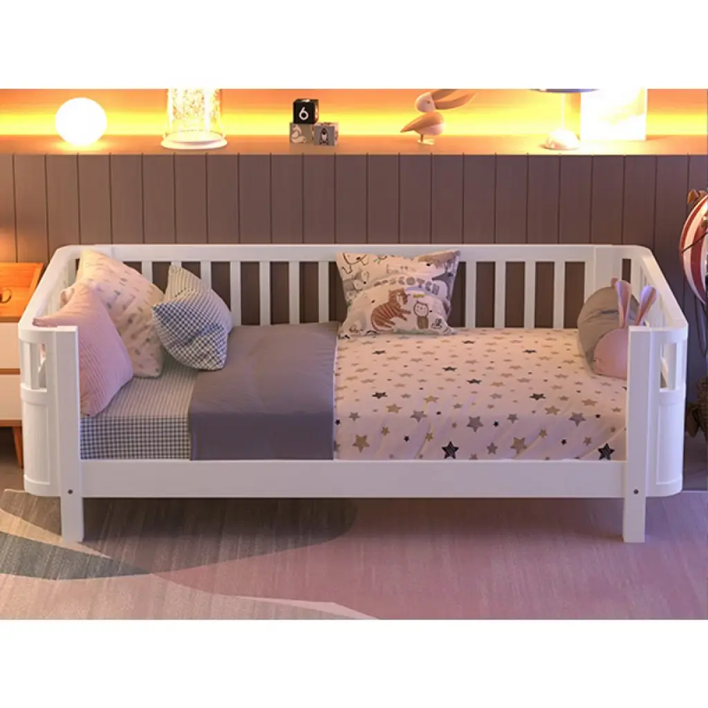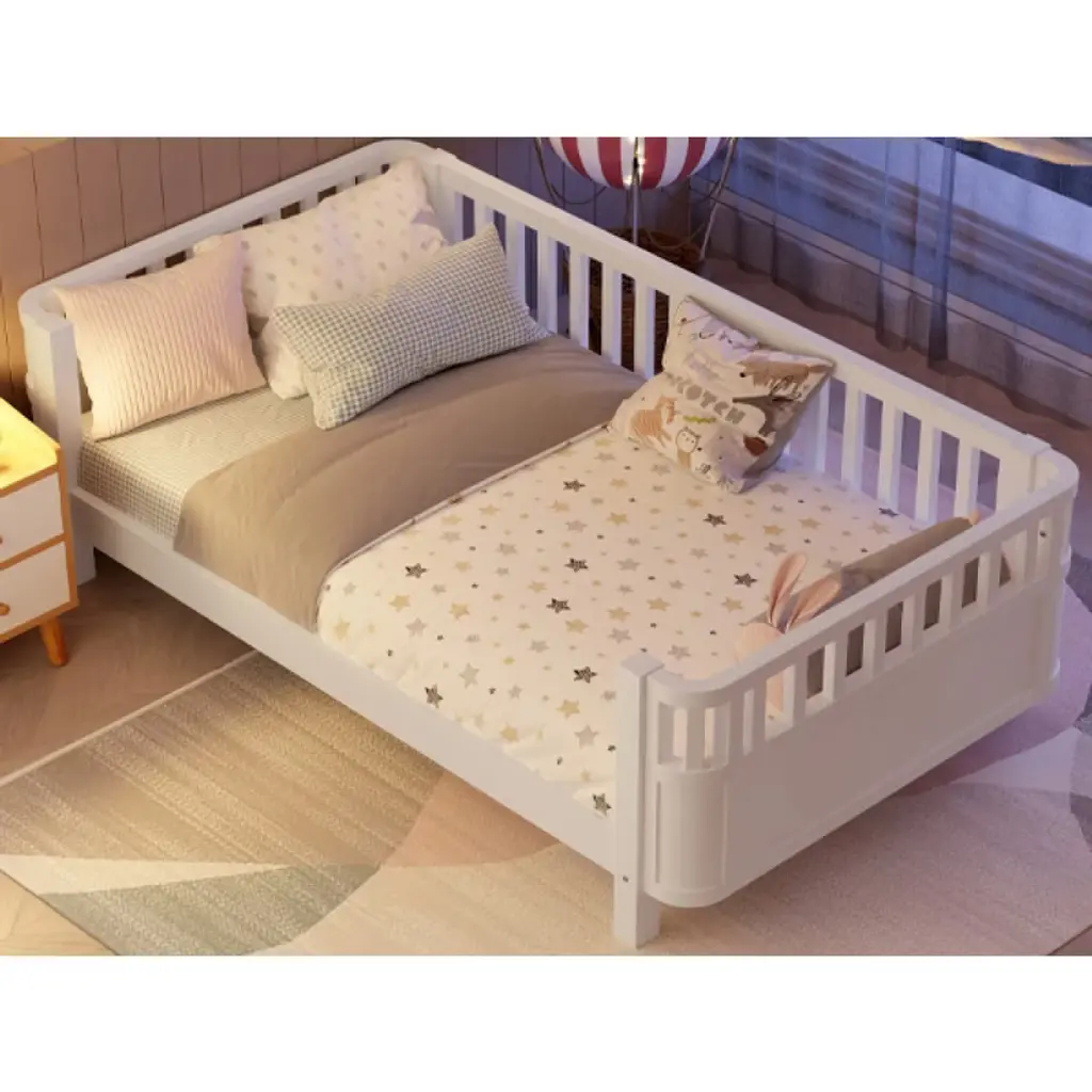 Product Features Low-to-Ground DesignIt is 5.5 inch from the kids bed frame to the floor, which makes this twin bed easy for your child to get in and out of, while also enhancing safety.Child-Friendly Safety DesignOur twin kids bed is designed with your children's safety in mind. The 4 corners of the bed are rounded, and the legs are placed inward to help avoid bumps and protect your child's feet.Versatile Usage OptionsThis kids bed offers multiple uses: place the side without rails against the wall for little kids, use it as a daybed, or position it next to a parent's bed for easier nighttime care. Plus, the right side rail can be removed when not needed — a flexible design that meets your growing child’s changing needs.Increased Safety with Thoughtful Fence DesignThis twin platform bed features a fence with a headboard, footboard, and sides to enhance safety. With a 2.8 inch gap in each fence, it effectively prevents pinch hazards.Durable and Sturdy ConstructionCrafted with a sturdy wooden frame made from a combination of solid wood, plywood, and MDF, this kids twin bed is both durable and safe. Its modern and elegant design blends seamlessly with a variety of room themes and color schemes, making it a delightful addition to any boy's or girl's room. Description This kids bed is designed with guardrails to provide a safe sleeping environment. Constructed from solid pine wood and MDF, it features a high-quality solid wood construction that ensures durability and high load capacity for long-lasting use. Description & Dimensions Size: TwinOverall Product Dimension: 77.4" x 41.9" x 24.2"Product Weight: N.W: 46.29 LBS / G.W: 56.21 LBSWeight Capacity: 250 LBSRecommended Mattress Thickness: 6–8 inchNumber of Slats: 9 pcsNumber of Packages: 1Box Spring Required: NoRemark: Different lighting or display settings may cause slight color differences.