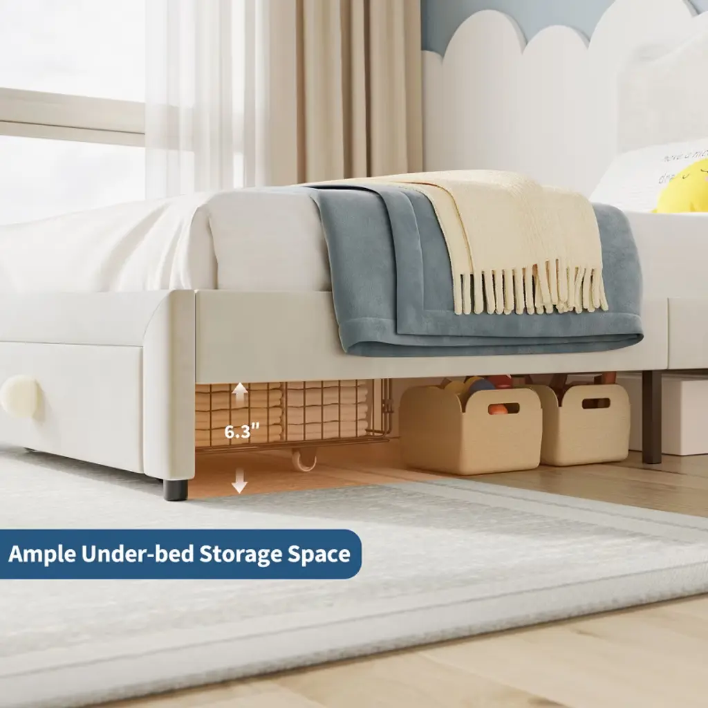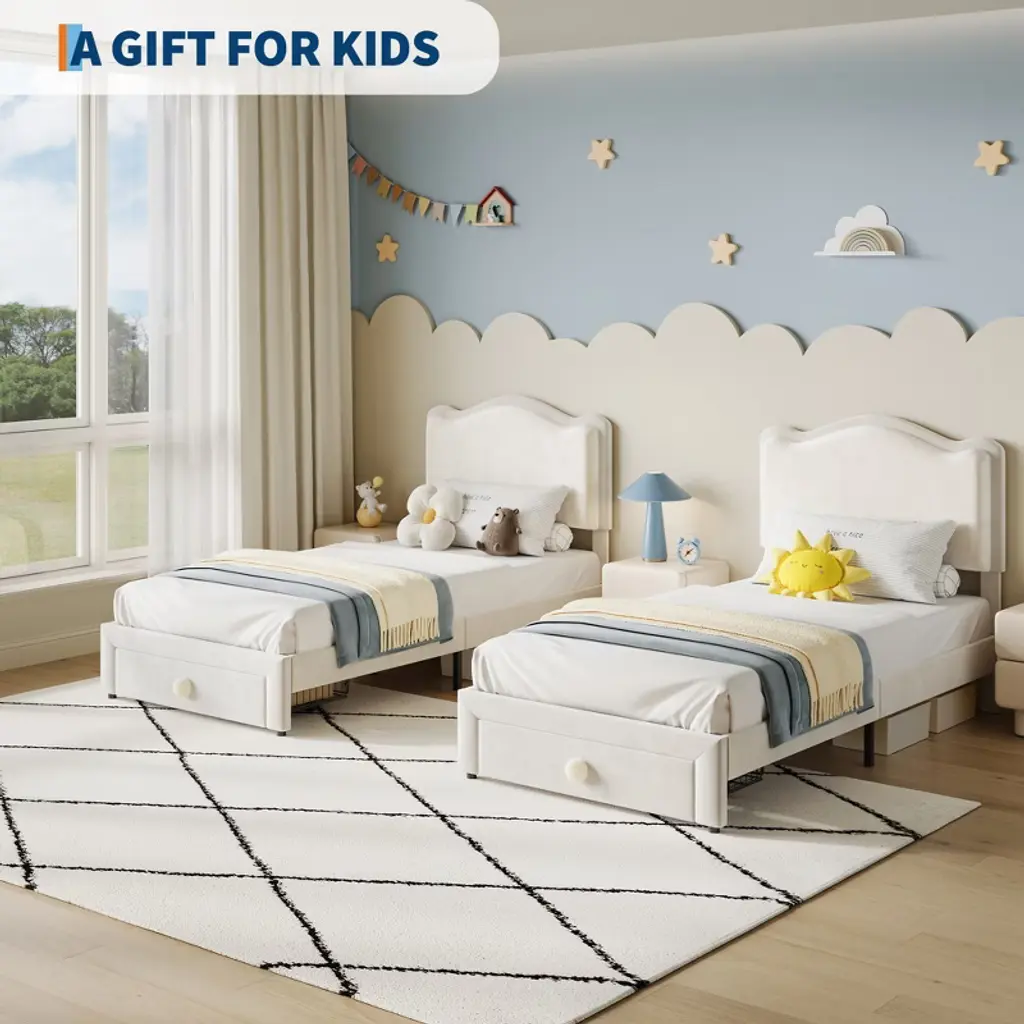 Upholstered Kids Bed Frame, Toddler Platform Bed With Headboard And Storage Drawer Beige
