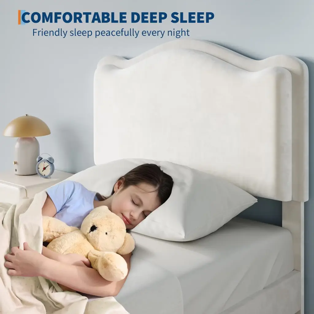 The kids bed frame features a kid-friendly curved design with soft, rounded edges for safety and a velvet fabric headboard for elegance. Perfect for boys and girls, it transforms any bedroom into a cozy, stylish space