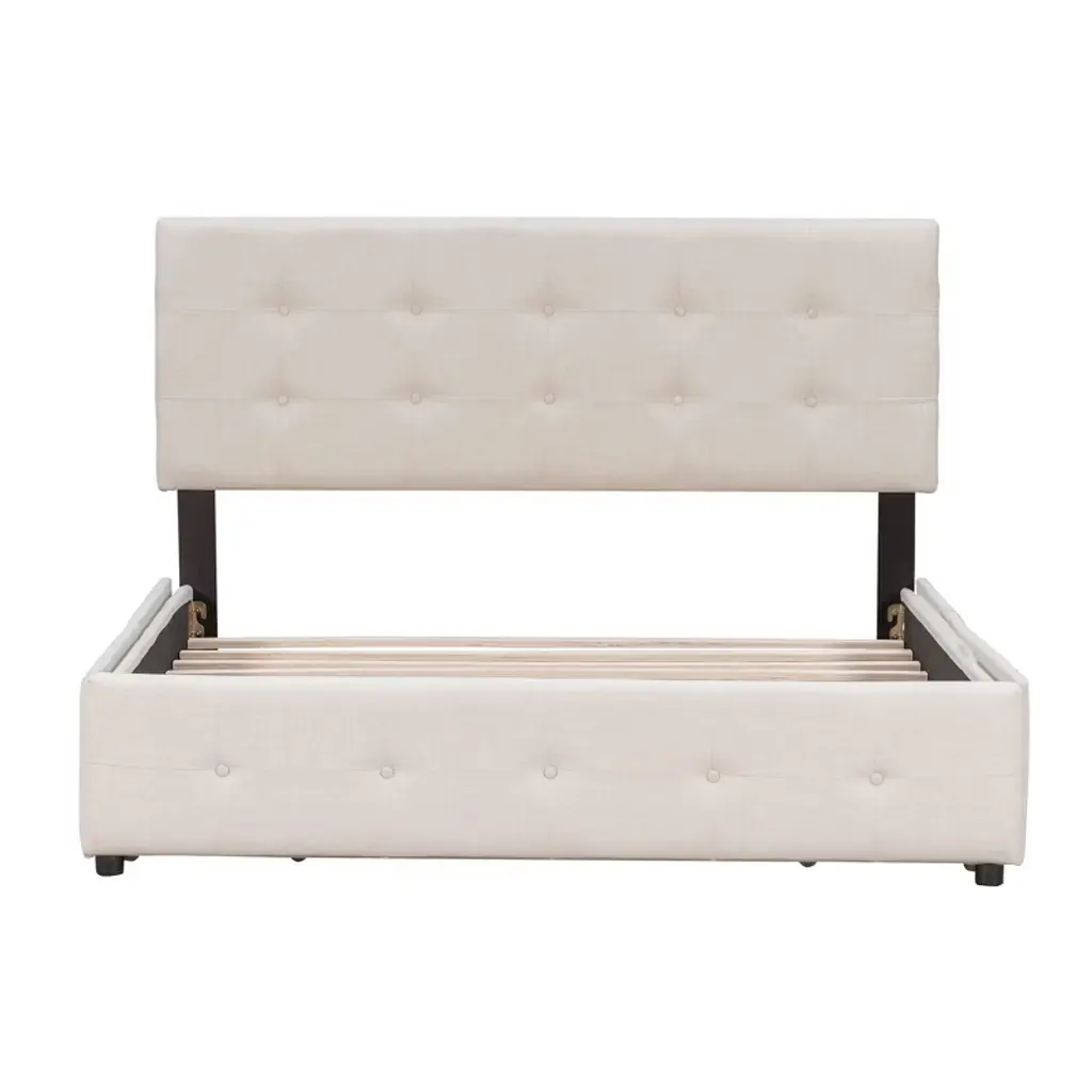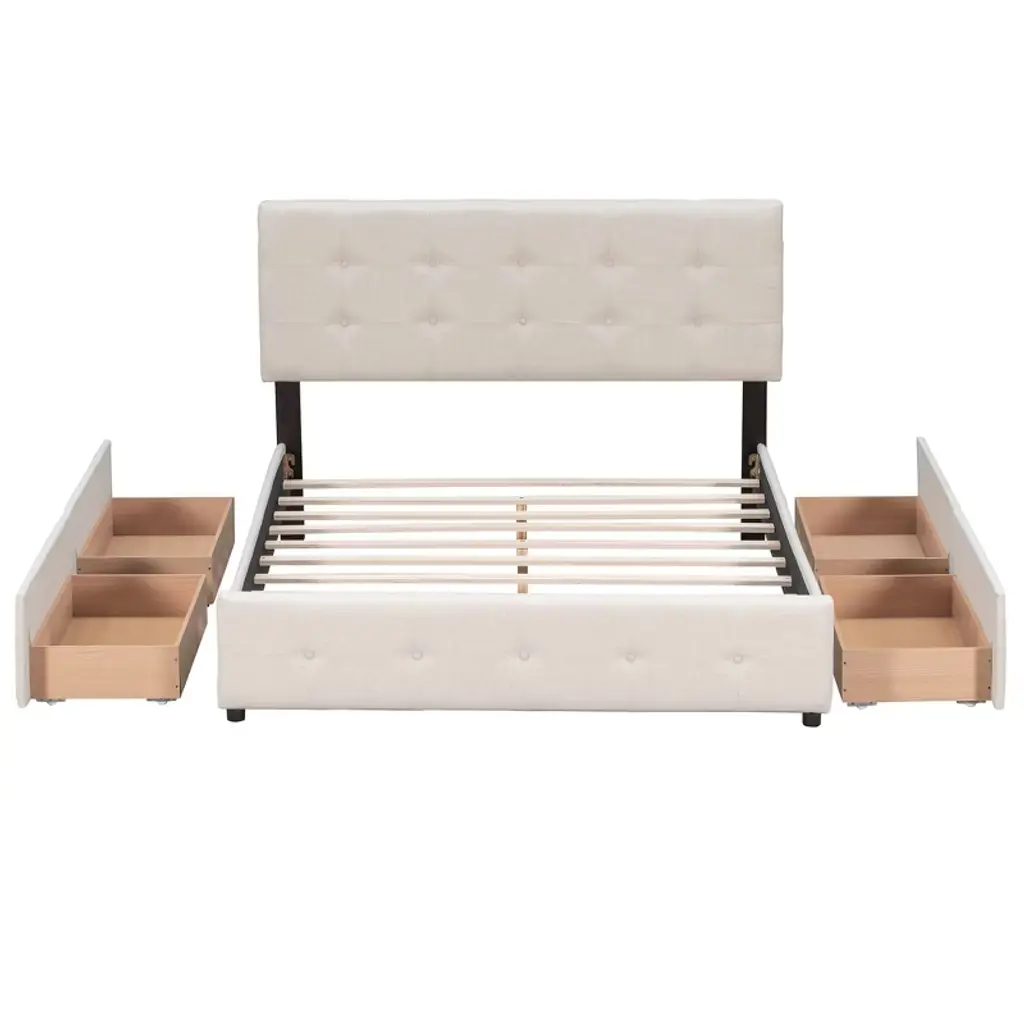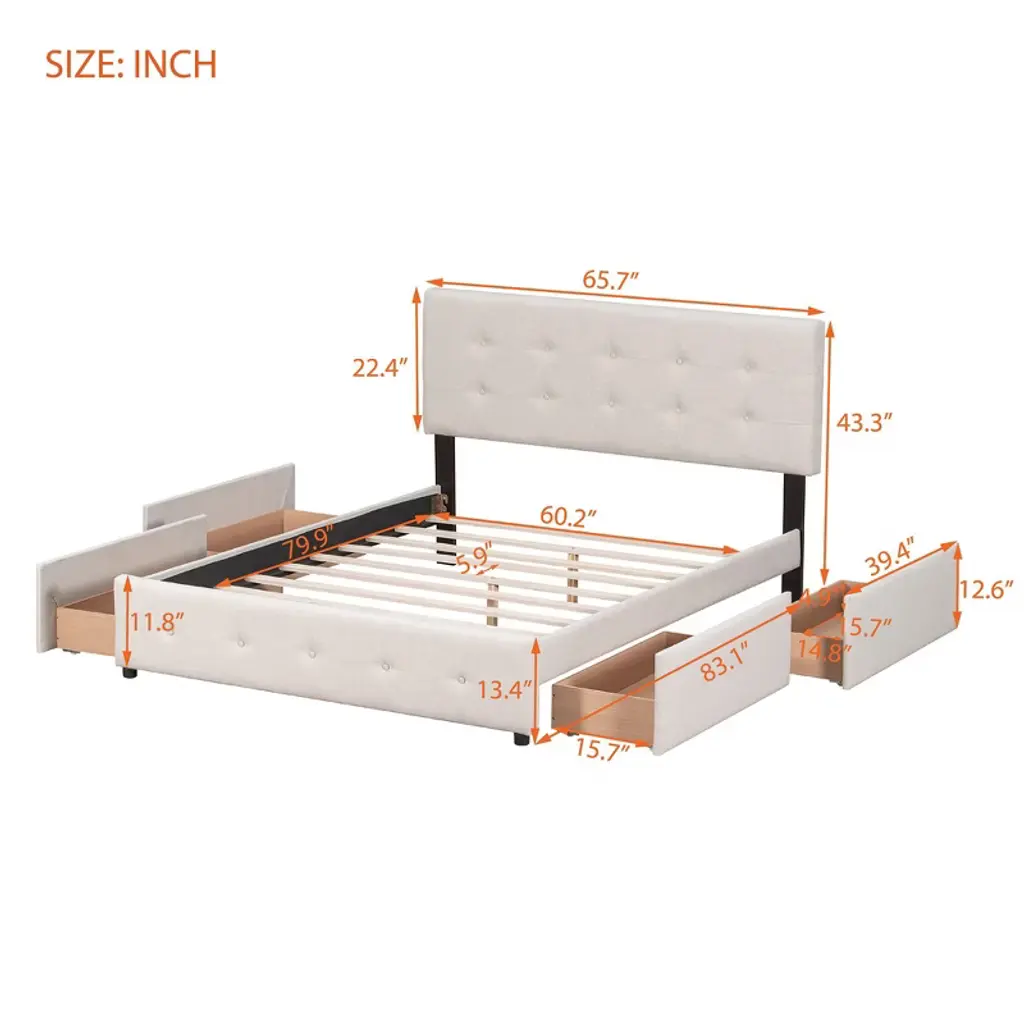 This beautiful Upholstered Platform Bed features button tufted upholstered headboard that adds a contemporary chic look to your bedroom and filled in thick foam to add extra comfort.Sturdy wood frame construction and a wooden slat system to add extra stability and safety. Despite its size and solidity, this piece comes with hardware and instructions included and anyone can assemble it, without a problem. The upholstered platform bed with four drawers can easily be pulled in and out for maximum storage space, perfect for organizing anything from clothes and bed linens to toys and games.