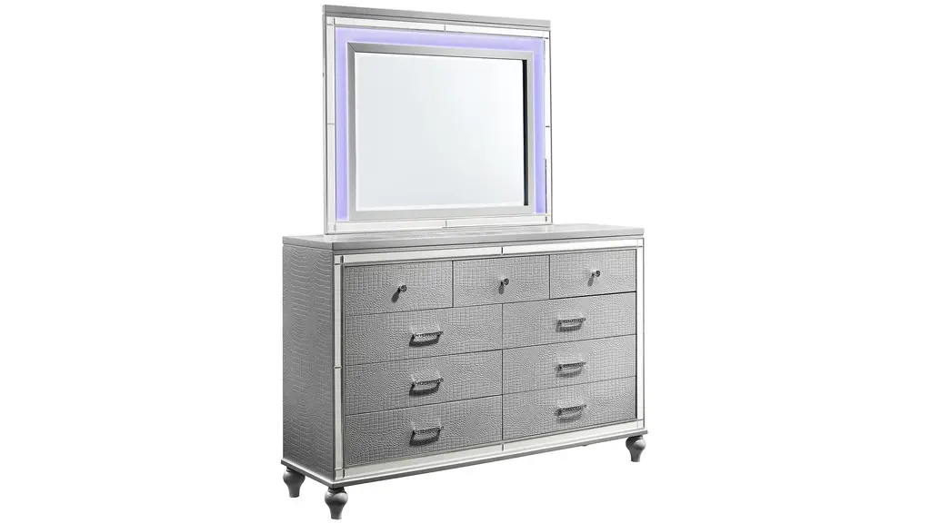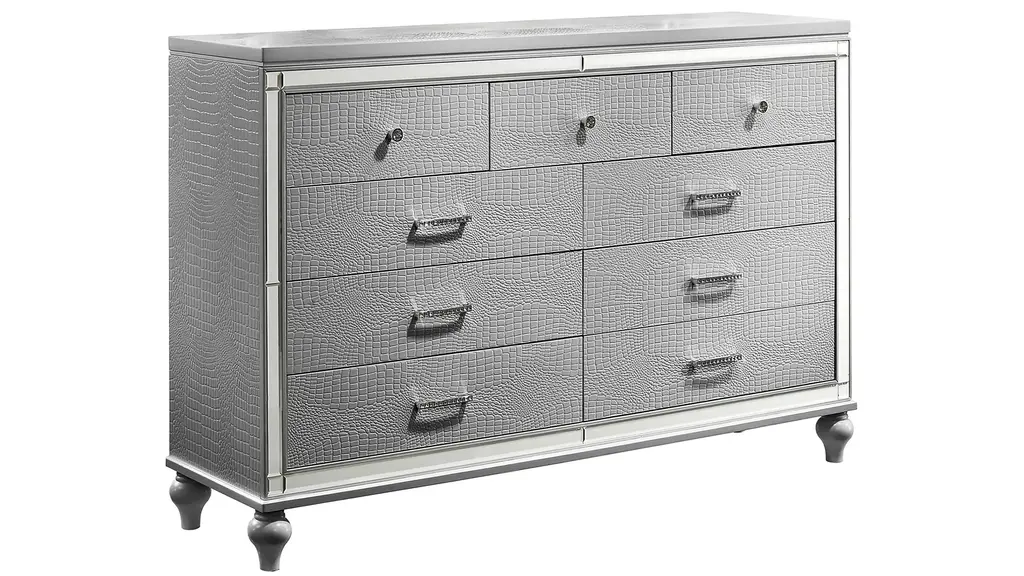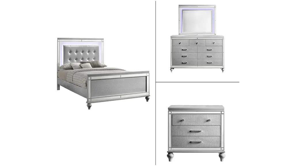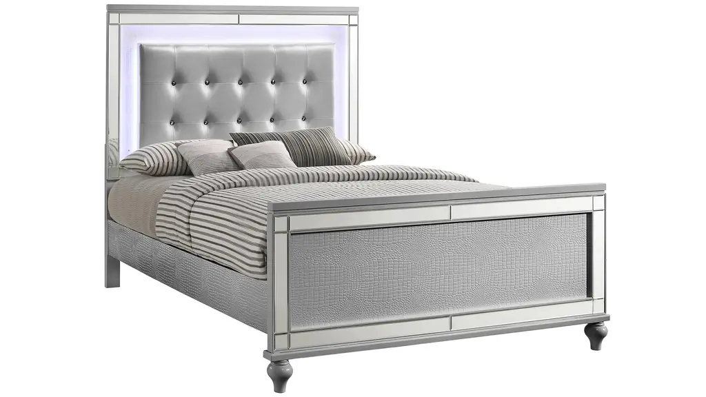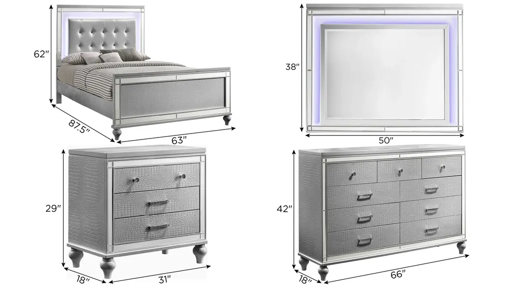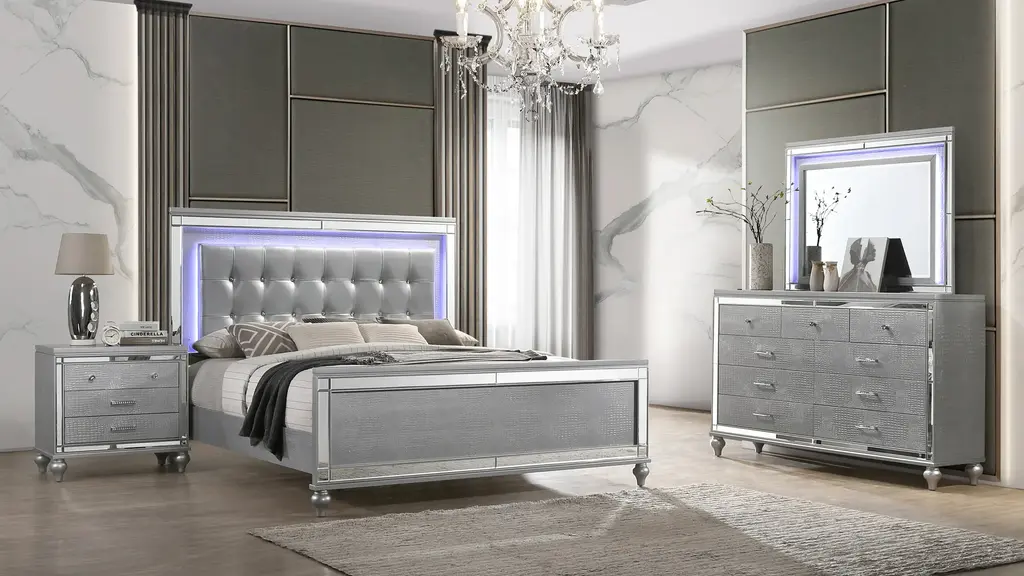 The Valentino 4-pc. Bedroom Set in Silver is an opulent collection designed to transform your bedroom into a glamorous retreat. This set includes a bed with touch lighting, a dresser, a lighted mirror, and a nightstand, all meticulously crafted from a durable combination of manufactured and solid woods with decorative embossed inlays, ensuring long-lasting quality and distinction. The bed features a crystal button-tufted padded headboard, a gleaming Silver finish, mirrored trims, and alligator embossed inlays, evoking an unparalleled Hollywood glam appeal. Soft LED lighting in the headboard and dresser mirror provides ambient illumination, creating an intimate and luxurious atmosphere. The nine-drawer dresser offers ample storage for clothing, while the three-drawer nightstand conveniently holds bedside essentials. This exquisite bedroom set combines extravagant style with exceptional craftsmanship, bringing a touch of star quality to your contemporary bedroom suite.