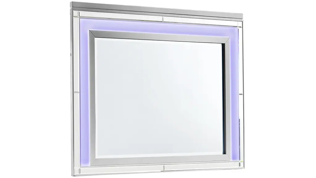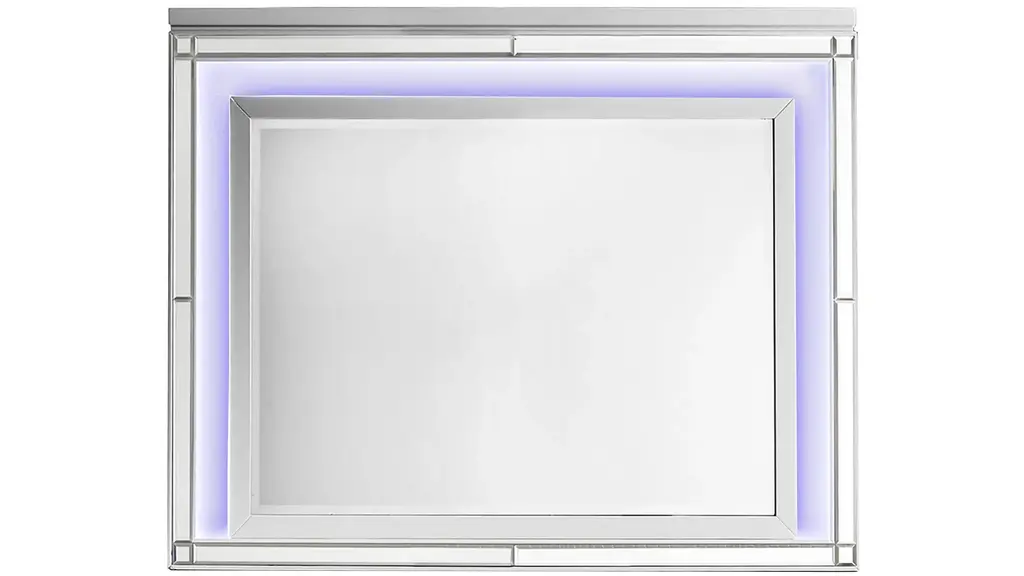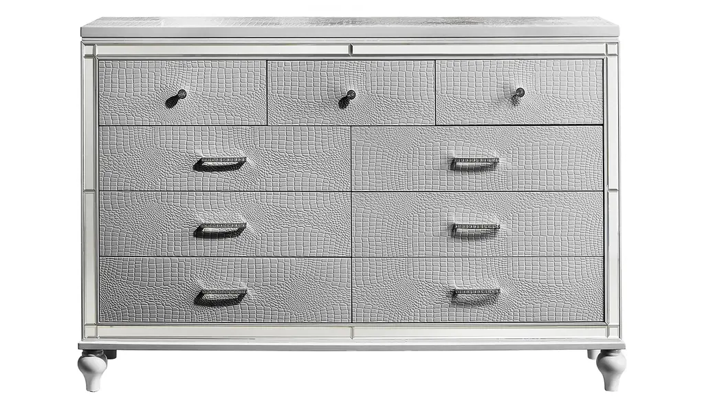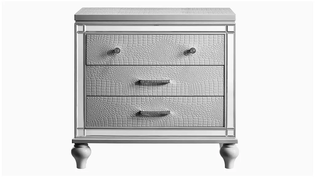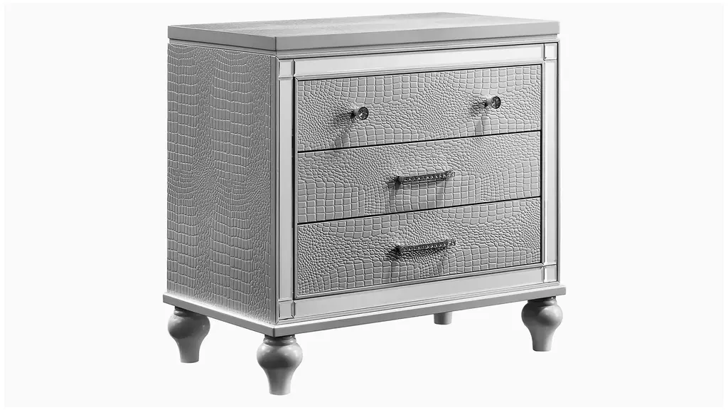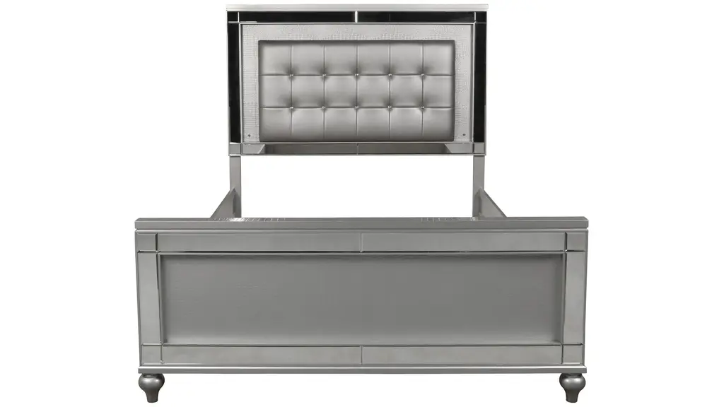 The Valentino 4-pc. Bedroom Set in Silver is an opulent collection designed to transform your bedroom into a glamorous retreat. This set includes a bed with touch lighting, a dresser, a lighted mirror, and a nightstand, all meticulously crafted from a durable combination of manufactured and solid woods with decorative embossed inlays, ensuring long-lasting quality and distinction. The bed features a crystal button-tufted padded headboard, a gleaming Silver finish, mirrored trims, and alligator embossed inlays, evoking an unparalleled Hollywood glam appeal. Soft LED lighting in the headboard and dresser mirror provides ambient illumination, creating an intimate and luxurious atmosphere. The nine-drawer dresser offers ample storage for clothing, while the three-drawer nightstand conveniently holds bedside essentials. This exquisite bedroom set combines extravagant style with exceptional craftsmanship, bringing a touch of star quality to your contemporary bedroom suite.