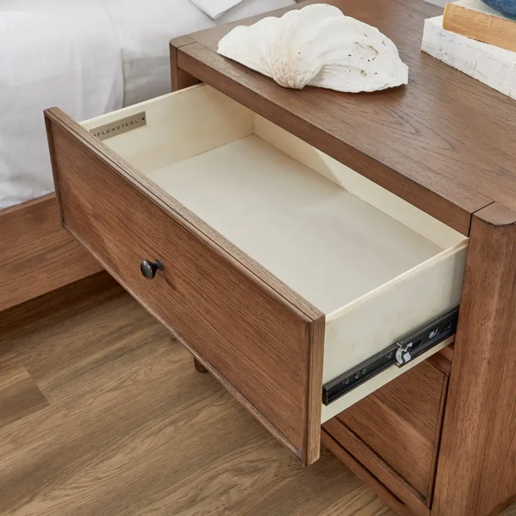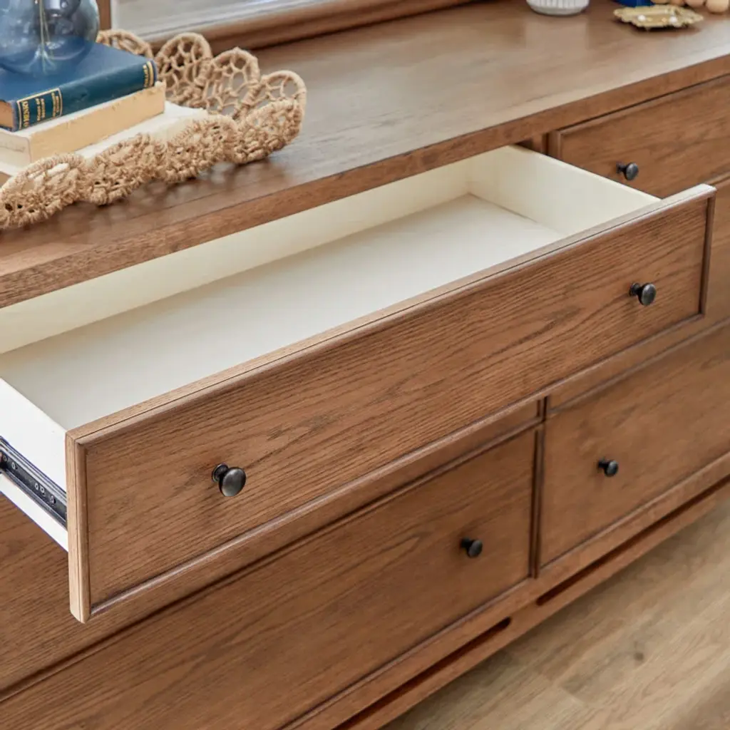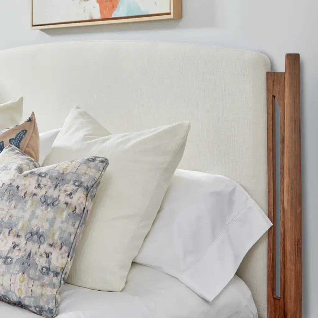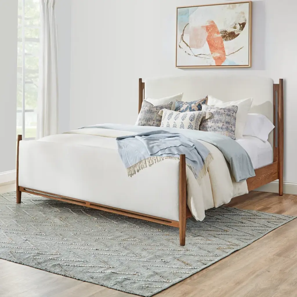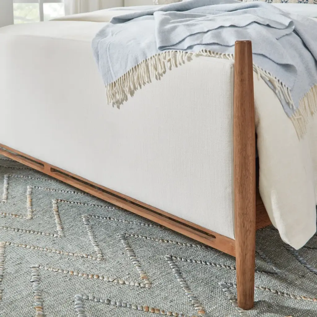 Introducing the Violet Bedroom Set, where transitional elegance meets timeless sophistication. This stunning collection features a platform bed, nightstand, dresser, and mirror, each piece designed to elevate your bedroom with a blend of minimalistic simplicity and refined detail. The Violet upholstered bed makes a striking statement with its soft curved details and medium brown oak finish. The headboard and footboard are upholstered in a cream-colored woven performance fabric, adding a touch of luxury and comfort to your sleeping space. Complementing the bed, the Violet nightstand offers both style and practicality. Its rich medium brown oak finish and soft curved base create an elevated look, while the antique bronze hardware adds a hint of classic charm. Featuring two soft-closing drawers and an integrated electrical outlet with power ports, this nightstand ensures convenience and elegance. The Violet dresser echoes the same transitional elegance with its soft curved base details and medium brown oak finish. Constructed from rubberwood solids and white oak veneers, and adorned with antique bronze hardware, this dresser boasts six soft-closing drawers, providing ample storage space while maintaining a sophisticated appearance. Completing the set, the Violet mirror adds a touch of refinement to any bedroom. With its soft curved details and medium brown oak finish, it can be mounted to the dresser or the wall to suit your space. Made from rubberwood solids and white oak veneers, this mirror combines functionality with timeless style. The Violet Bedroom Set is designed to be an enduring staple in your home, embodying the ultimate in functionality and sophistication.