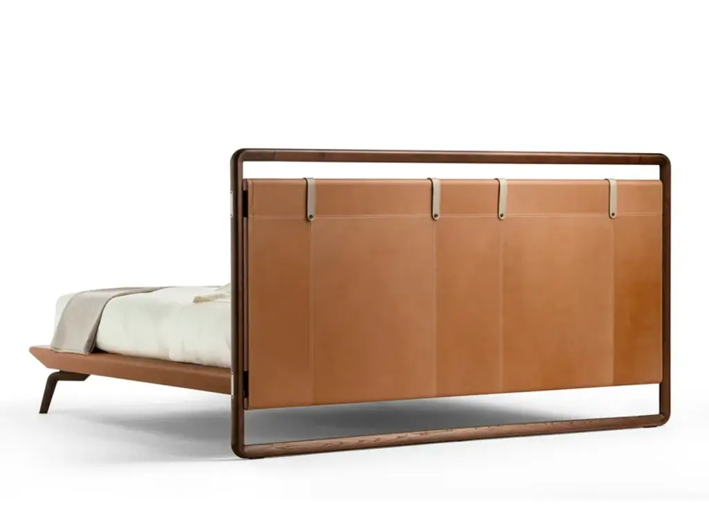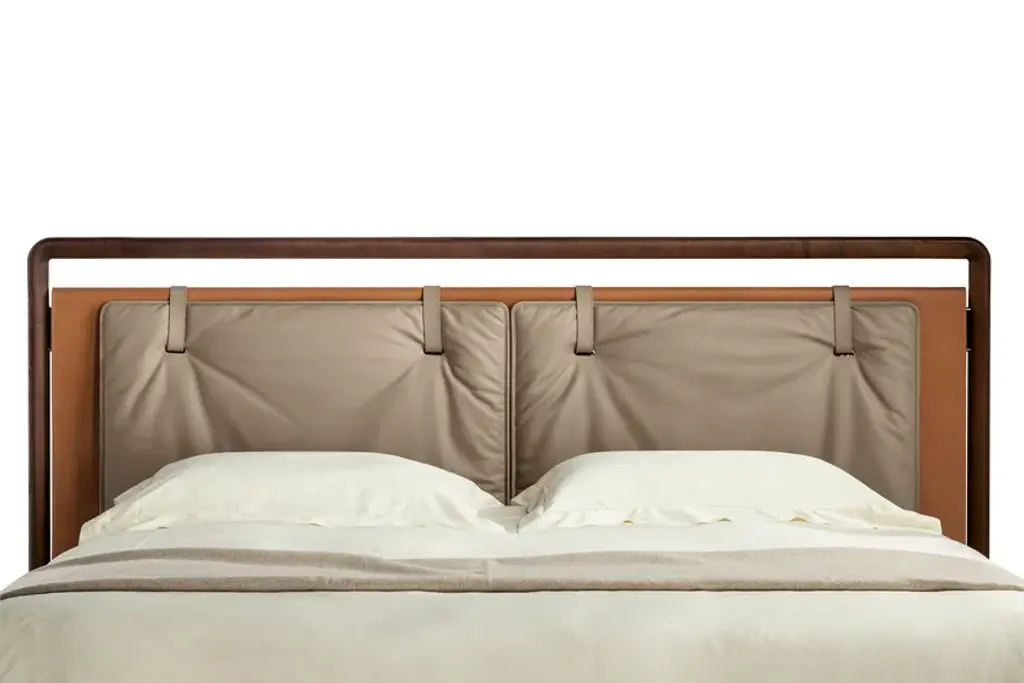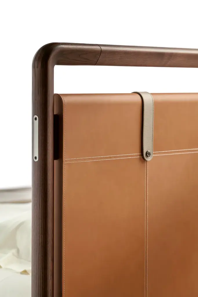 With the Volare Due bed, Roberto Lazzeroni revisits the previous Volare, playing with the contrast between tension and suspension that accentuates the various volumes of the bed and its combinations of leather, wood, saddle leather and fabric.The result is a new version of the product which exudes the same elegance as the original model but without the imposing grandeur of a four-poster bed.The precise design gives rise to a sizeable structure, luxurious in terms of its processing and natural materials, yet discrete and measured at the same time. The Volare Due bed becomes an oasis of comfort and relaxation, perfect for a position in the middle of the room but equally at home against the wall. A warm and welcoming object in terms of its colours and textural combinations.The Volare Due bed has a triangular profile in solid ash wood with moka finish. The bed frame is in tulipwood and entirely upholstered in Cuoio Saddle Extra or Pelle Frau® leather, just like the headboard, which is made of solid beech with internal crossbars in birch plywood and infill with hardboard panels. The headboard is attached to the structure using metal spacers with gunmetal grey finish and held in place using plates with the same finish. The central crossbar and leg, corner plates and cable brackets are made from black painted steel sheet metal.Two soft and sumptuous pillows, padded with polyester wadding and cotton canvas, are attached to the headboard via two leather belts. On the front of the headboard the belts pass through a metal eyelet with gunmetal grey finish and are fixed to the back by buttons also with a gunmetal grey finish and the Poltrona Frau logo. The cushions are upholstered in Pelle Frau® leather or fabric refined with leather border piping.Bed slats are sold separately