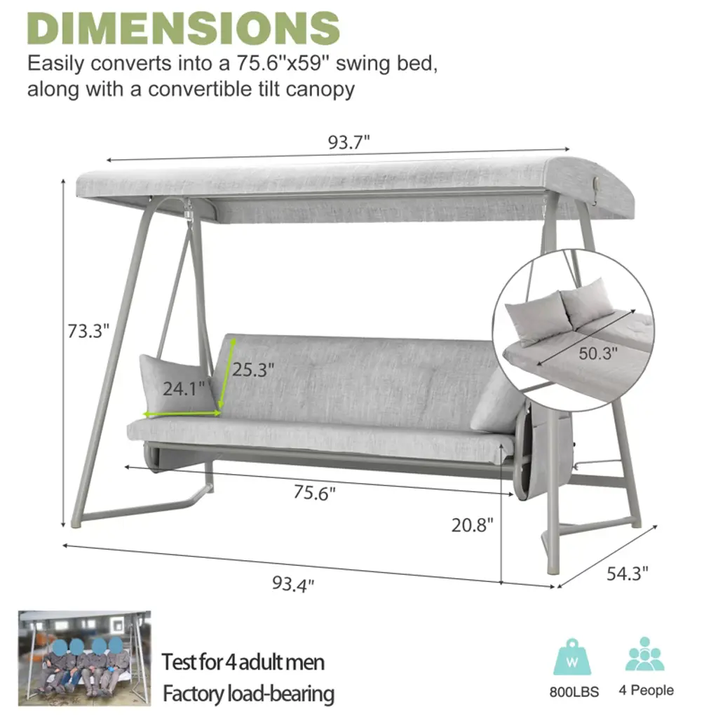 Whisen 93.8 In. W 3-person Metal Patio Swing Chair Swing Bed With Cushion And Adjustable Canopy - Champagne