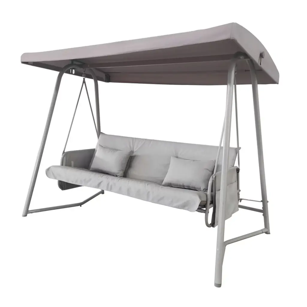 This patio swing chair comfortably seats three people and is ideal for enjoying your leisure time. The swing suspension has been upgraded to a bearing construction to ensure a quieter and more durable swing. The seat and backrest are made of fabric, which is waterproof, easy to clean, durable and breathable. The frame is made of steel with a professional rust-resistant finish and a high-end outdoor powder coating. This swing can be used as both a seat and a bed, easily transitioning between a three-person swing chair or a 2-person swing bed.