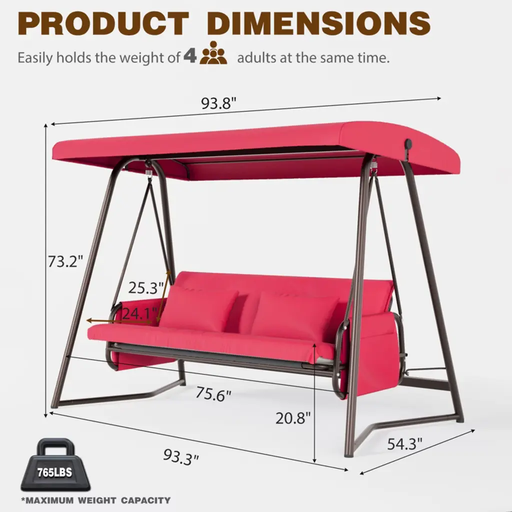 Whisen 93.8 In. W 3-person Metal Patio Swing Chair Swing Bed With Cushion And Adjustable Canopy - Red