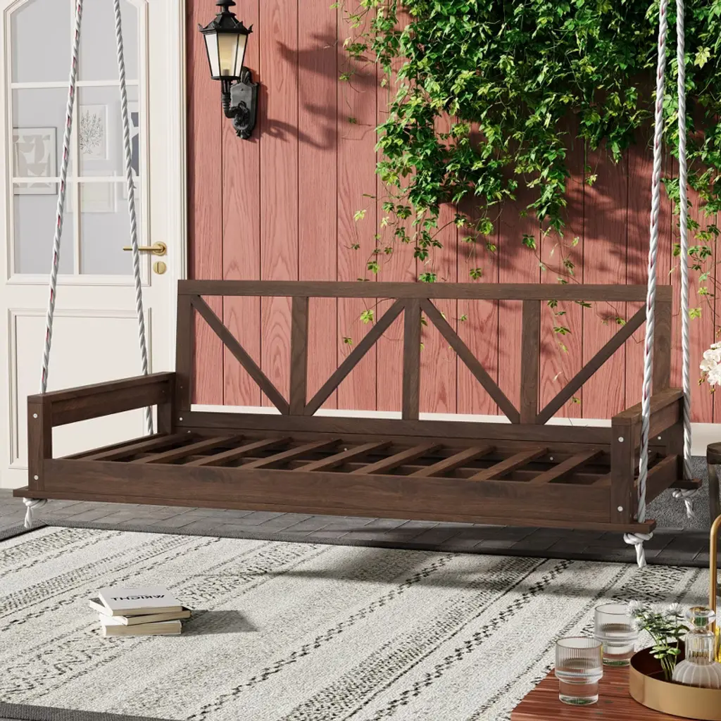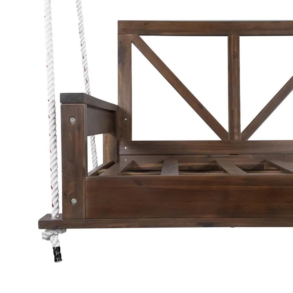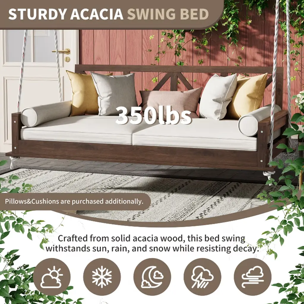 Enjoy outdoor comfort and style with this twin-size porch swing bed, crafted from durable, weather-resistant acacia wood. Available in multiple finishes, it blends beautifully with any patio, garden, or porch. The high-back ergonomic design offers lumbar support, making it perfect for reading, relaxing, or stargazing. With reinforced joints, sturdy side arms, and a 350lbs weight capacity, it ensures safe, stable use. Two included 16.4ft hemp ropes provide strong, secure hanging on porches or pergolas. Whether you're spending a quiet moment alone or lounging with a pet, this swing bed creates a cozy retreat right in your own backyard.