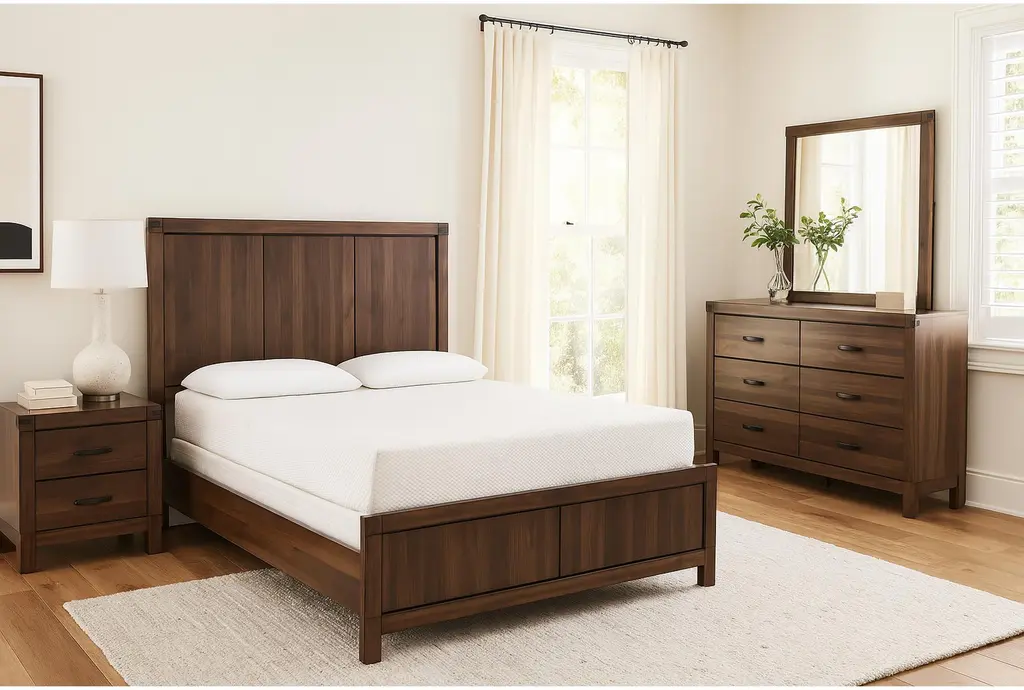 Transform your bedroom into a cozy retreat with the Willow Creek King Wood 4 Piece Bedroom Set. This traditional set, finished in Columbian Walnut, features a panel bed, dresser, and nightstand, offering both style and functionality for your sleeping space.