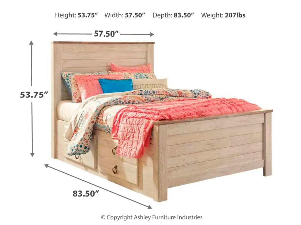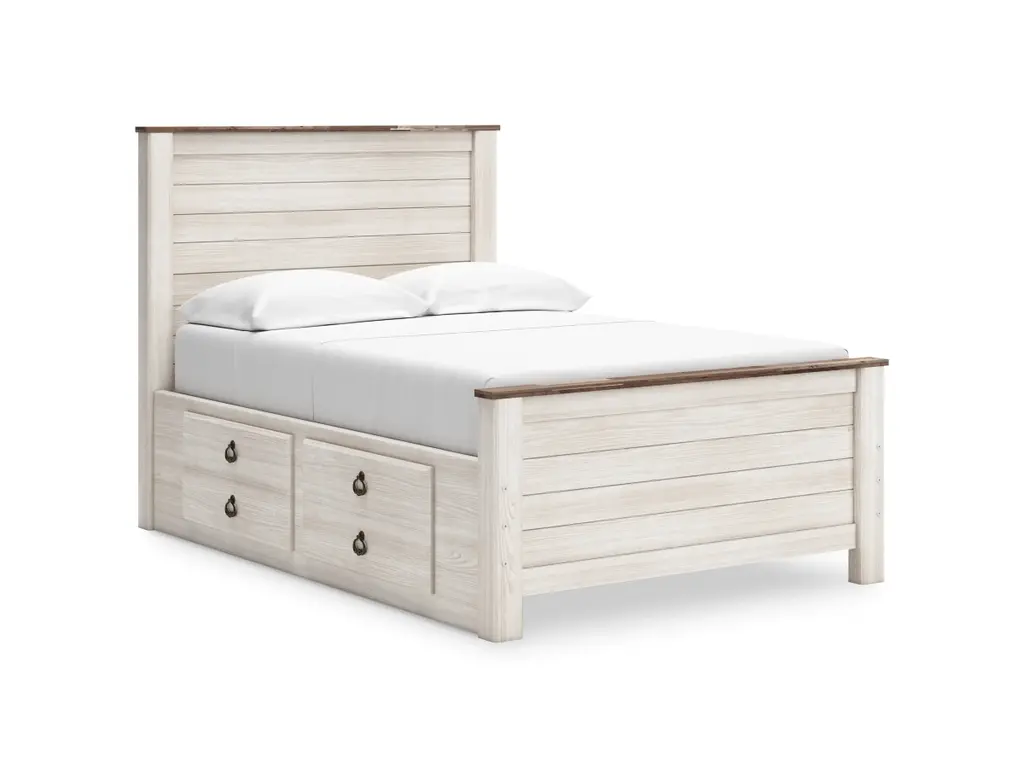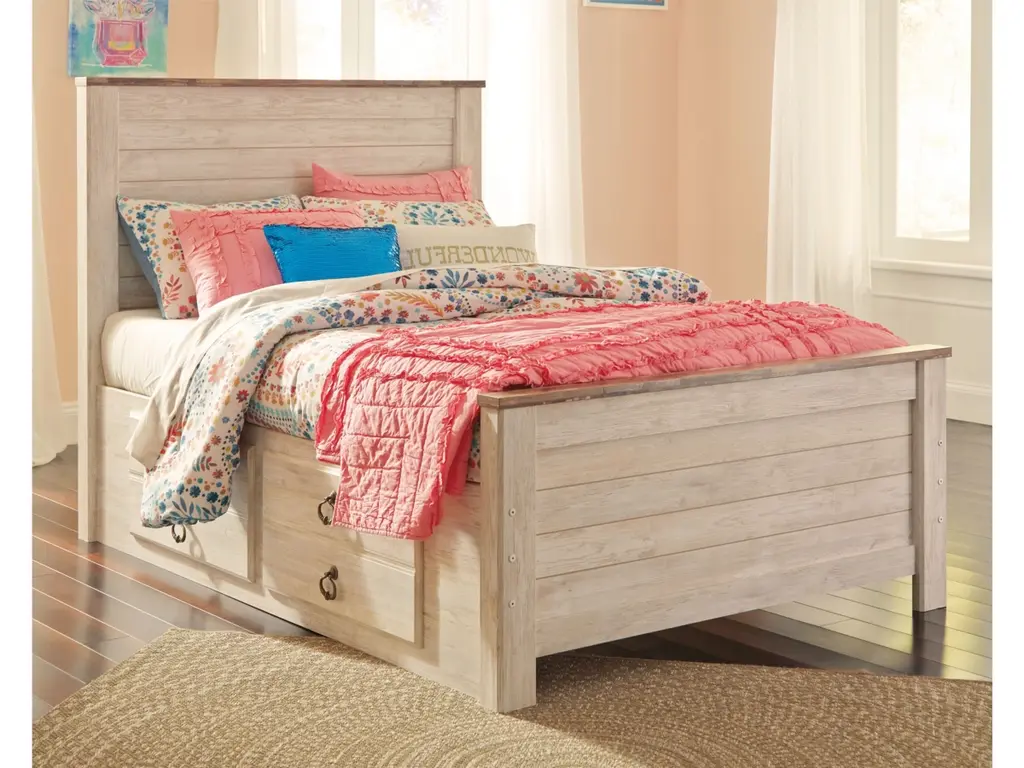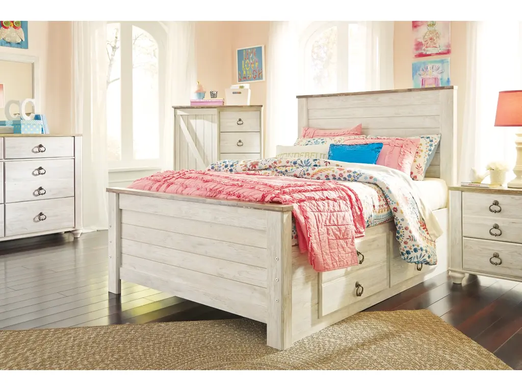 The Willowton full panel bed with storage is the ultimate statement piece for a coastal cottage or shabby chic inspired retreat. Its whitewash finish is wonderfully easy on the eyes. Faux plank tops on the headboard and footboard infuse a driftwoody look that has our minds drifting away to beachy-keen escapes. Two smooth-gliding drawers keep linens, blankets and jammies close at hand. Mattress sold separately.