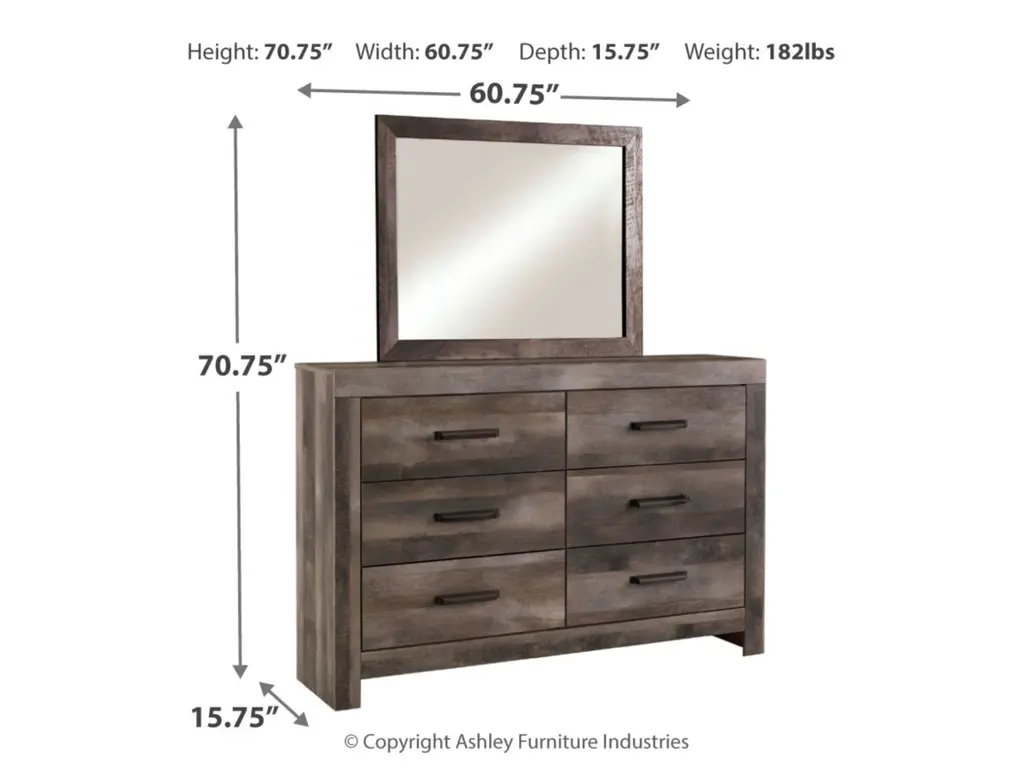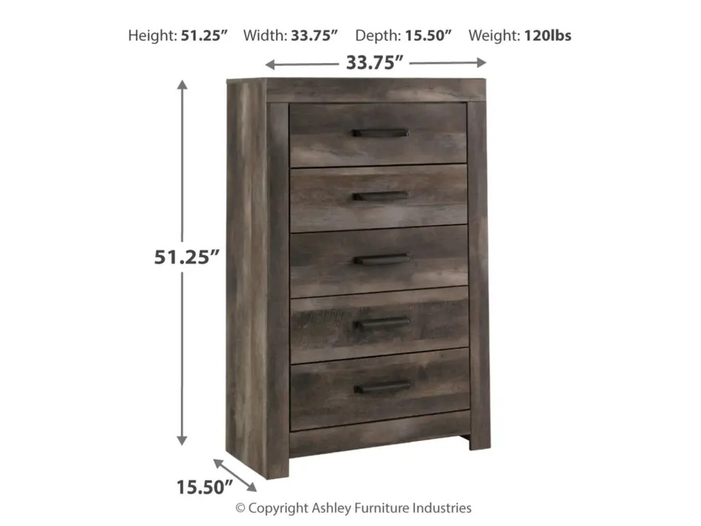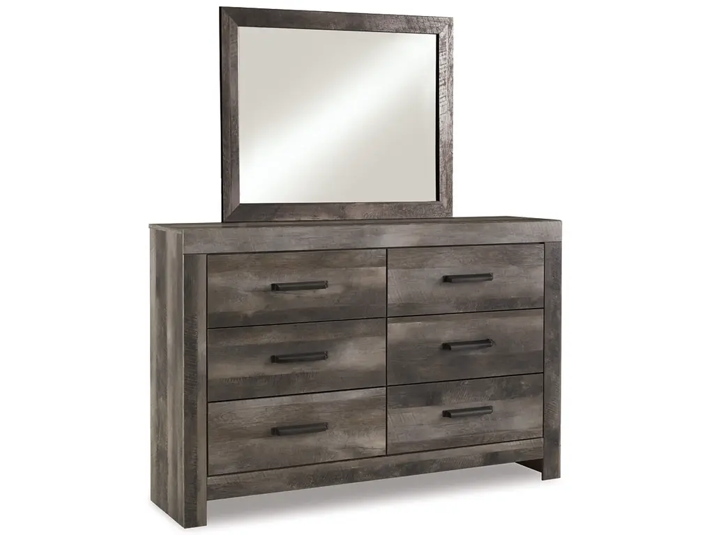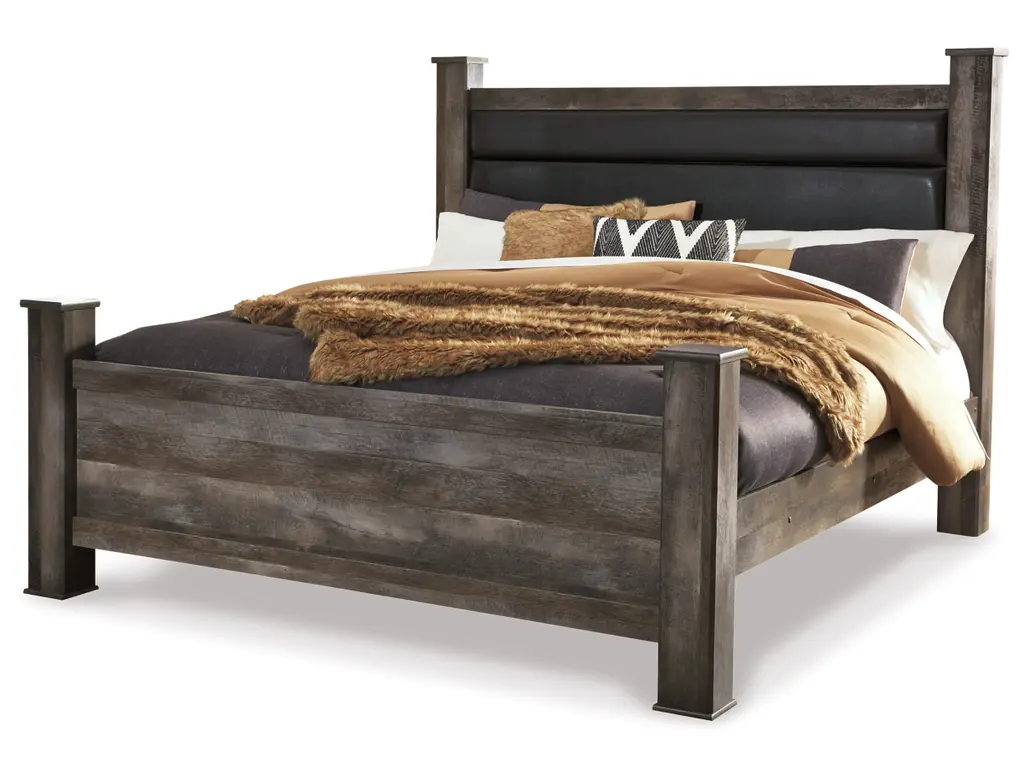The Wynnlow bedroom package is sure to win your heart with its daring designer take on modern rustic. Its crisp, clean and minimalist-chic profile is enriched with a striking replicated oak grain with thick plank styling and a weathered gray finish for that much more authentic character. The bed's padded black faux leather upholstered headboard with deep channeling adds flair and a sumptuous feel. The dresser and chest feature large-scale hooded pulls gracing the flush-mount drawers.