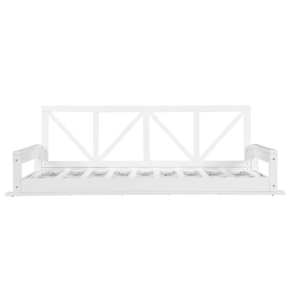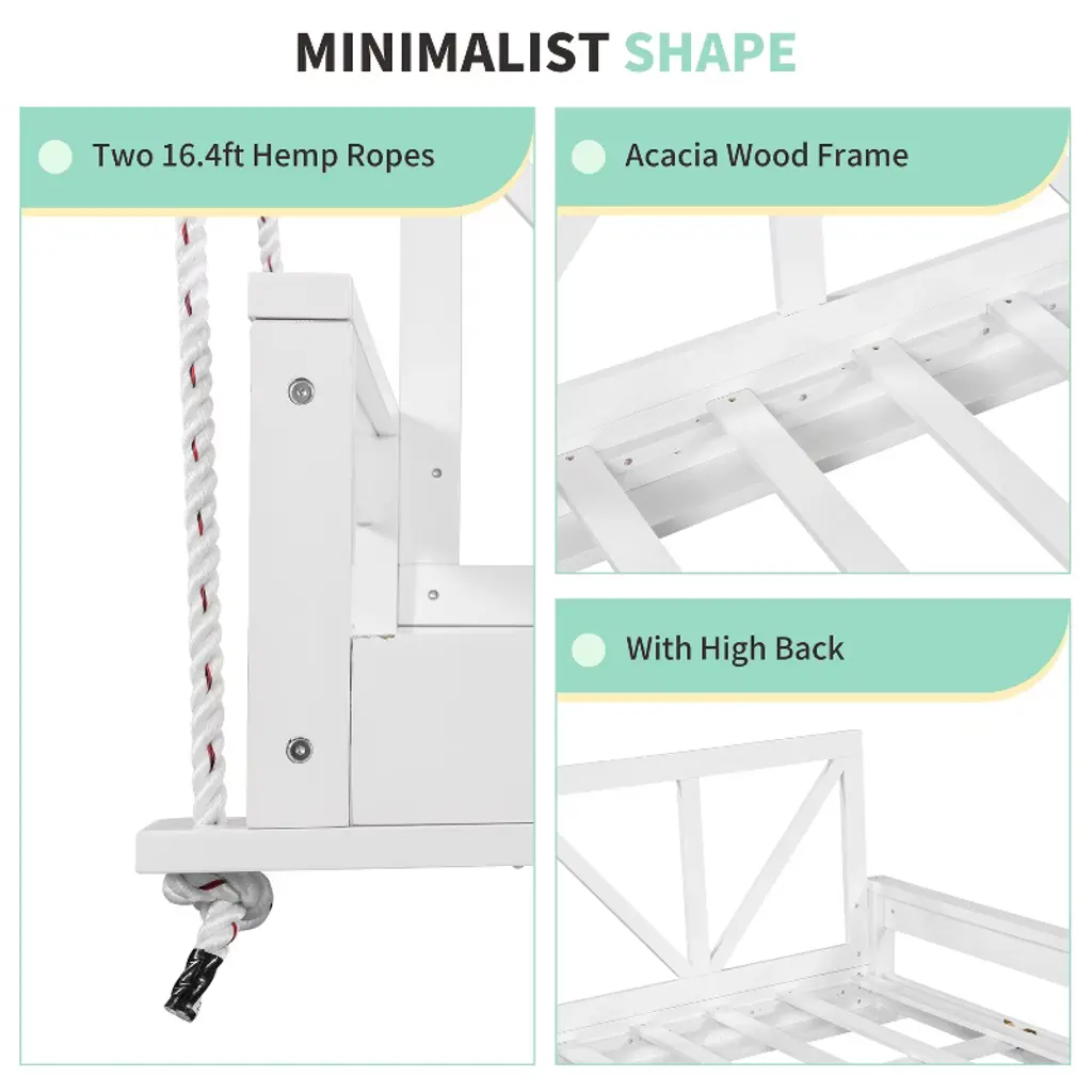 Experience relaxation with our Acacia Wood Twin Size Swing Bed.This elegant swing bed is crafted from solid acacia wood, known for its natural resistance to rain and decay.With a high backrest and dual armrests, it offers ergonomic support for reading, napping, or stargazing.The swing bed features two 16.4ft hemp ropes for secure hanging and can support up to 350lbs.Available in some colors, it blends seamlessly with any outdoor space. It fits a standard twin mattress (sold separately) and provides a minimalist yet cozy retreat for your porch, garden, or covered patio.